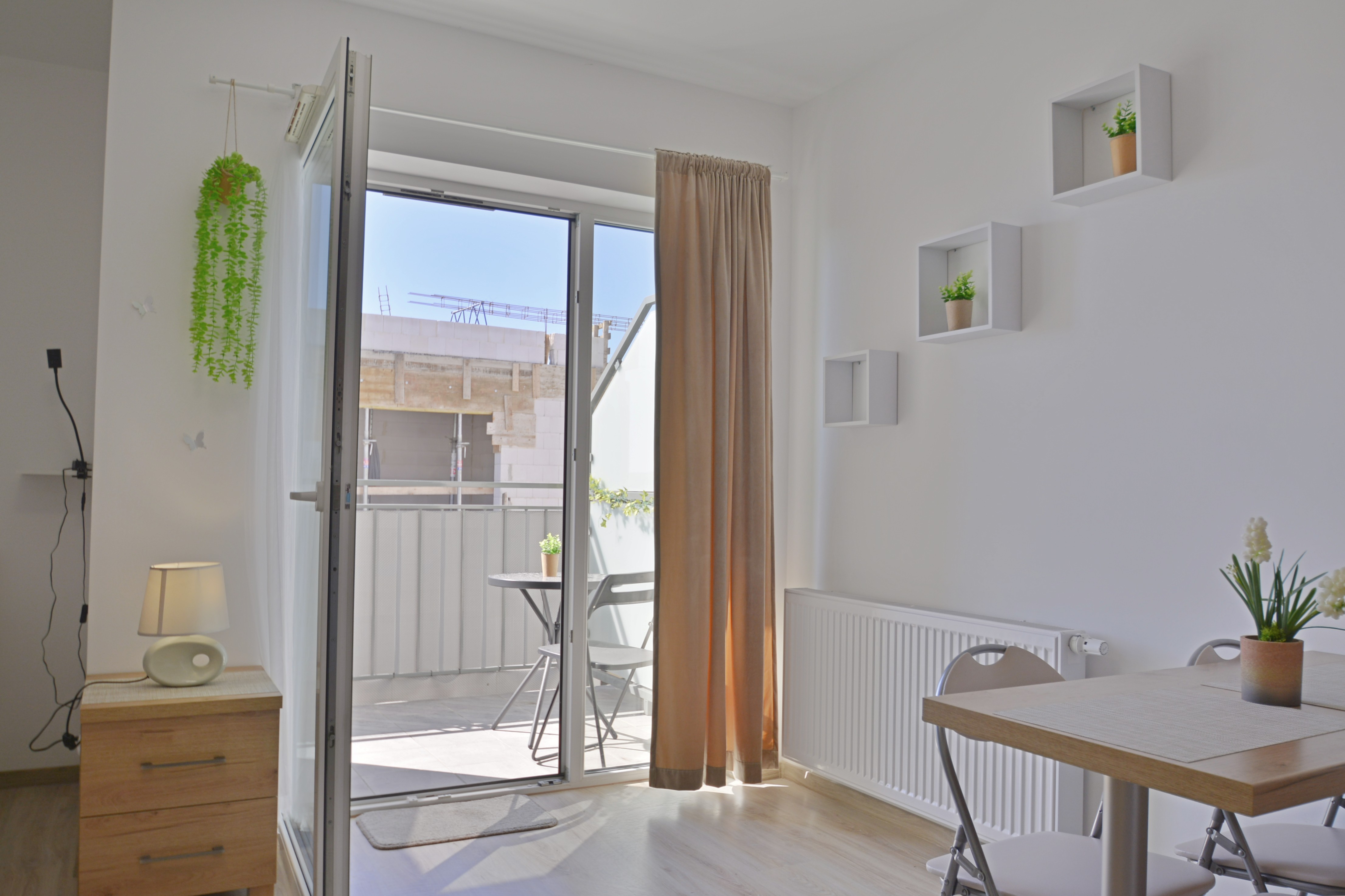 Apartament nr 44, to kameralne studio z aneksem kuchennym, który jest podstawowo wyposażony. Wygodne łóżko o szerokości 140cm i rozkładana sofa to propozycja dla maksymalnie 3 osób. Posiada dużą łazienkę z prysznicem oraz umeblowany balkon. Nasza propozycja urządzona jest w przyjemnych dla oka beżowo-piaskowych kolorach. Do mieszkania nie przynależy miejsce parkingowe. Obok budynku prowadzone są prace budowlane.