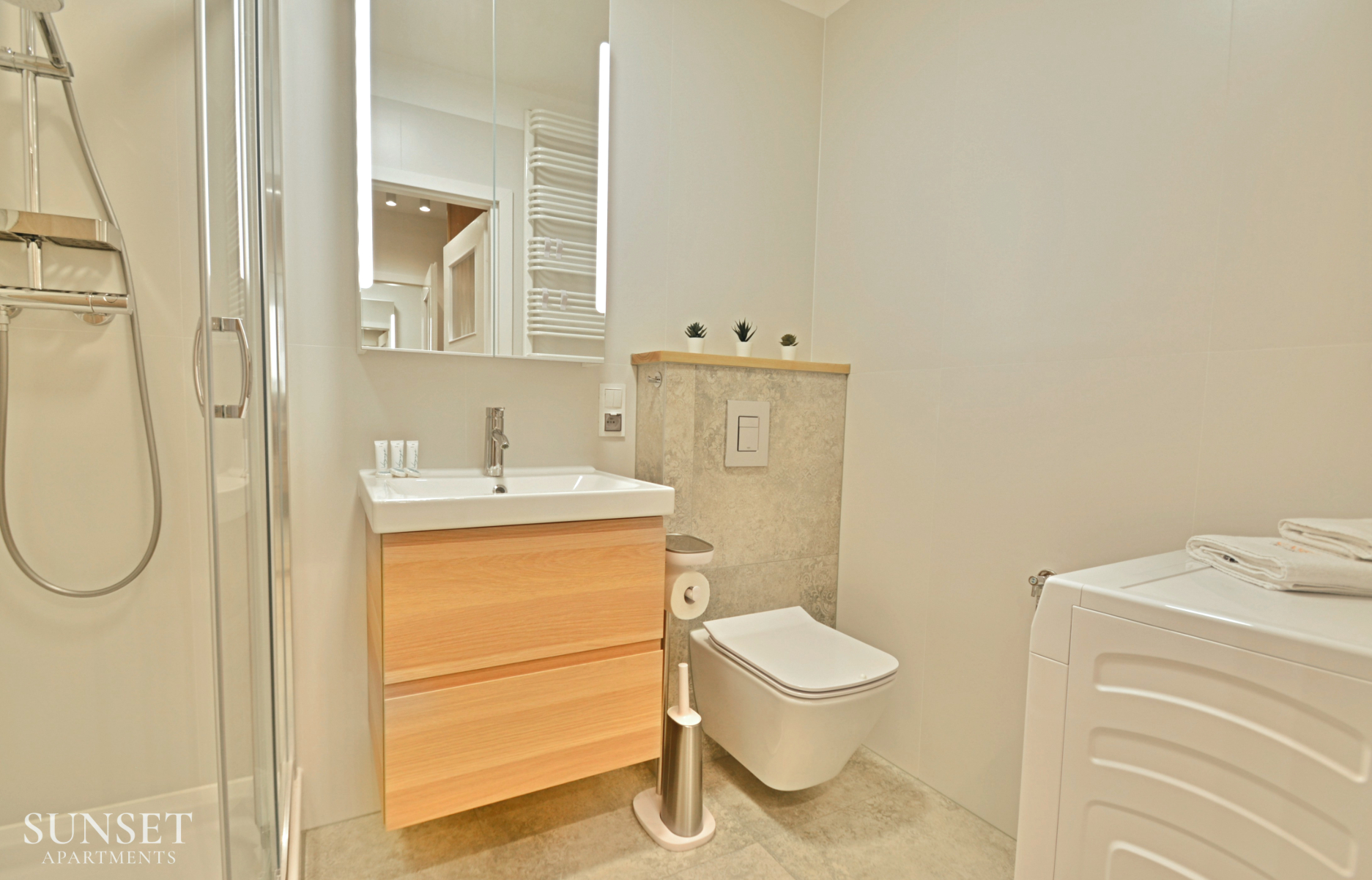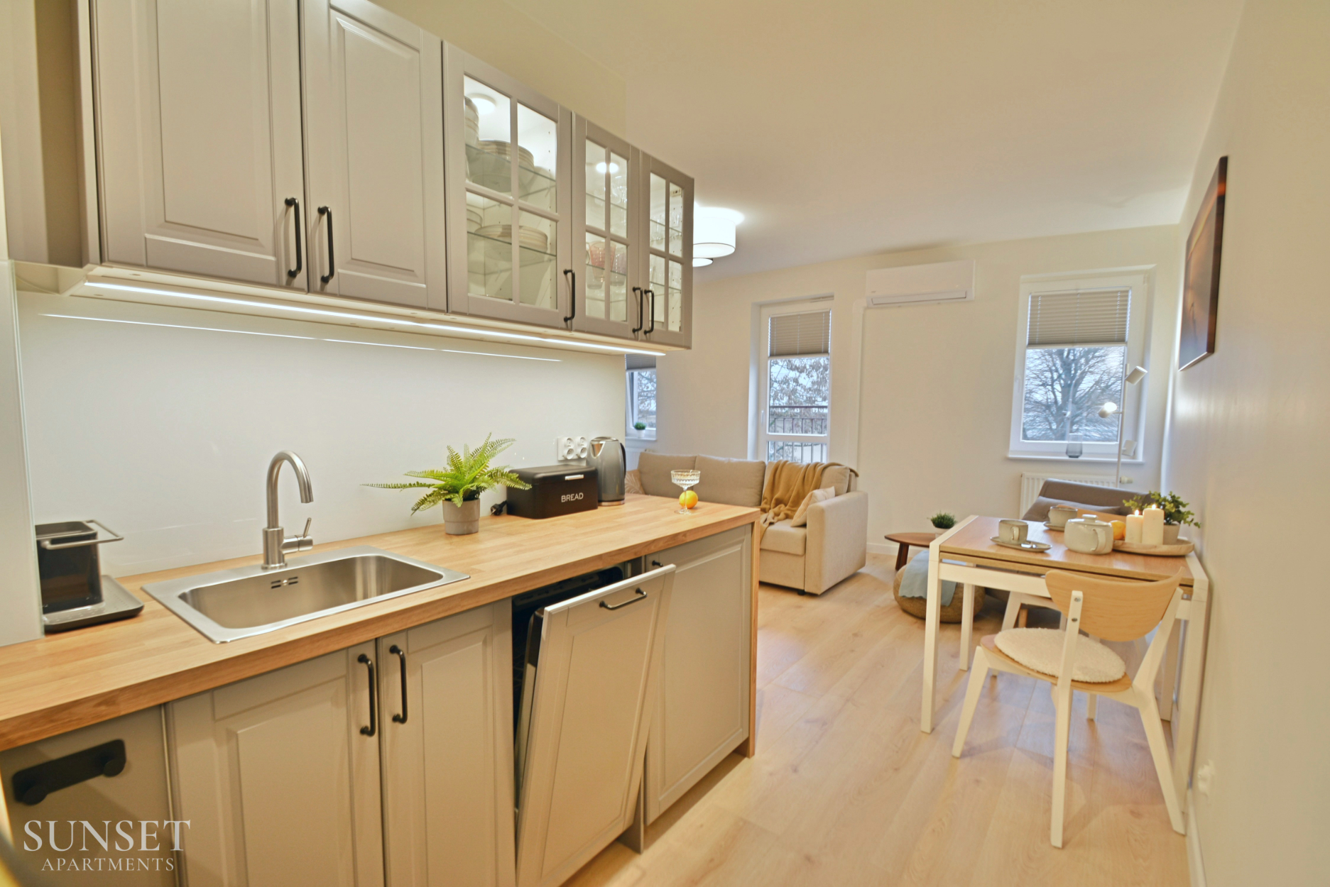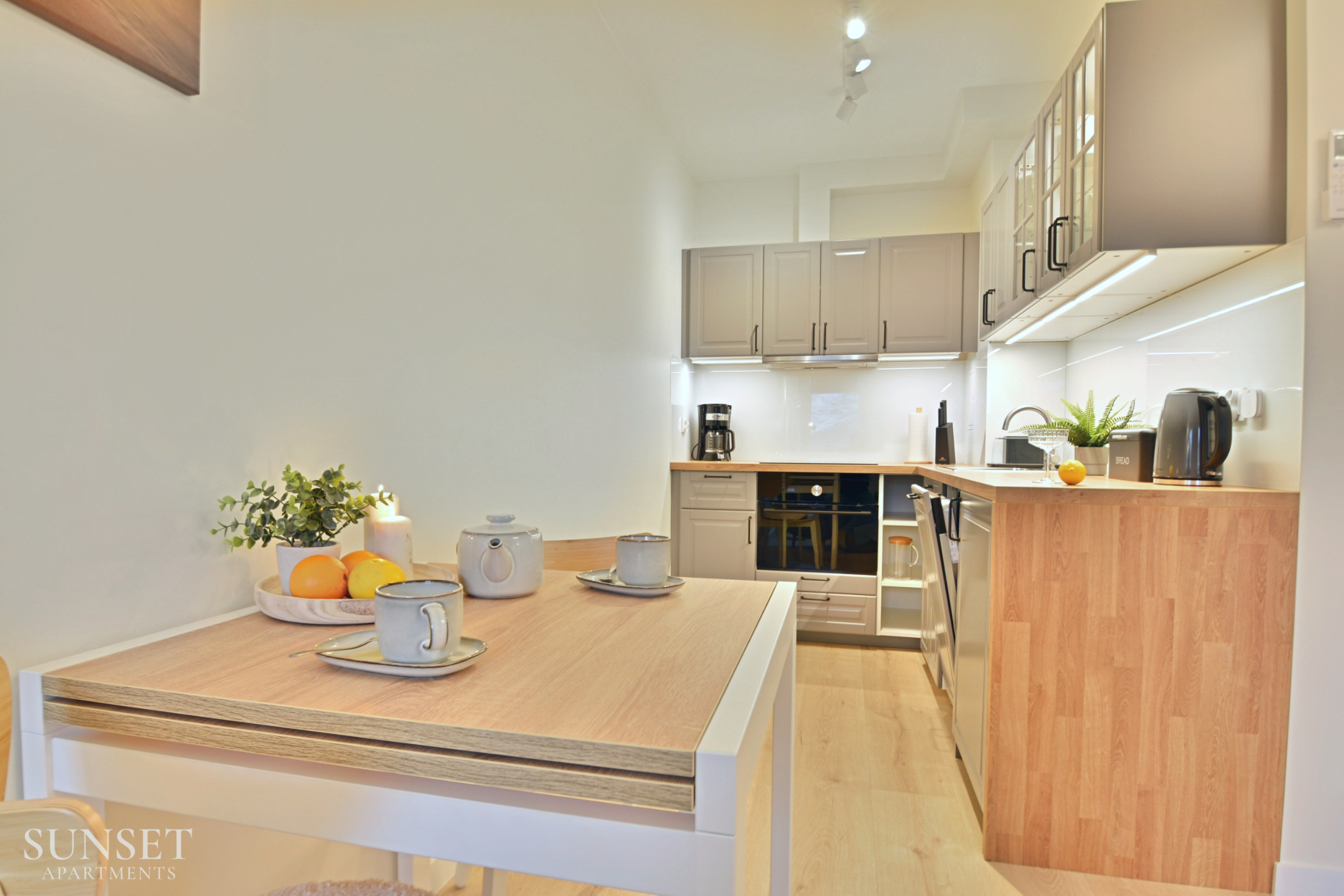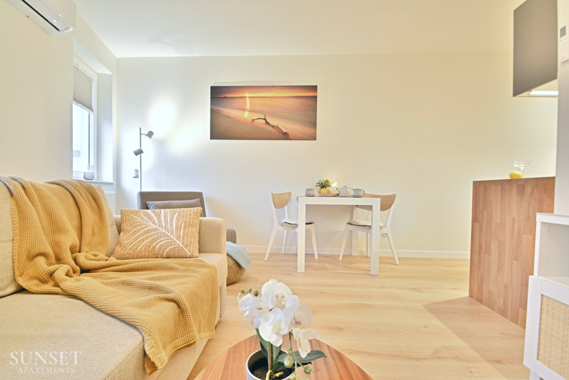 Prezentowana oferta przygotowana jest dla pobytu max. 3 osób. Przytulna kawalerka urządzona jest w piaskowo miodowych barwach. W pełni wyposażony aneks kuchenny ze zmywarką połączony jest z niewielkim salonem, w którym znajdziemy wygodną rozkładaną sofę dla dwóch osób i mały rozkładany fotel. Z mieszkania jest częściowy widok na port oraz Muzeum Rybołówstwa Morskiego. W ciepłe dni pobyt umili zamontowana w mieszkaniu klimatyzacja. Łazienka wyposażona jest w pralkę. Do mieszkania nie przynależy prywatne miejsce parkingowe.