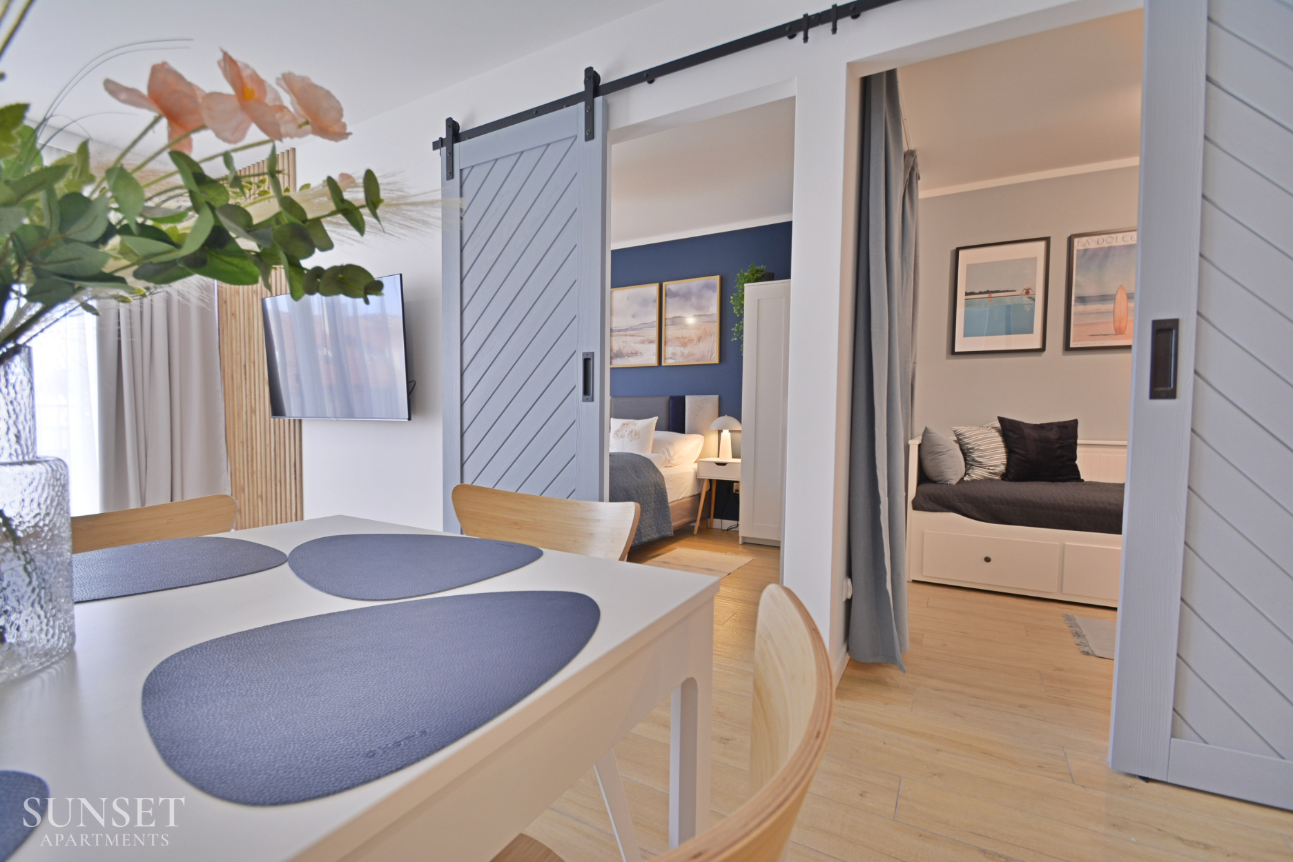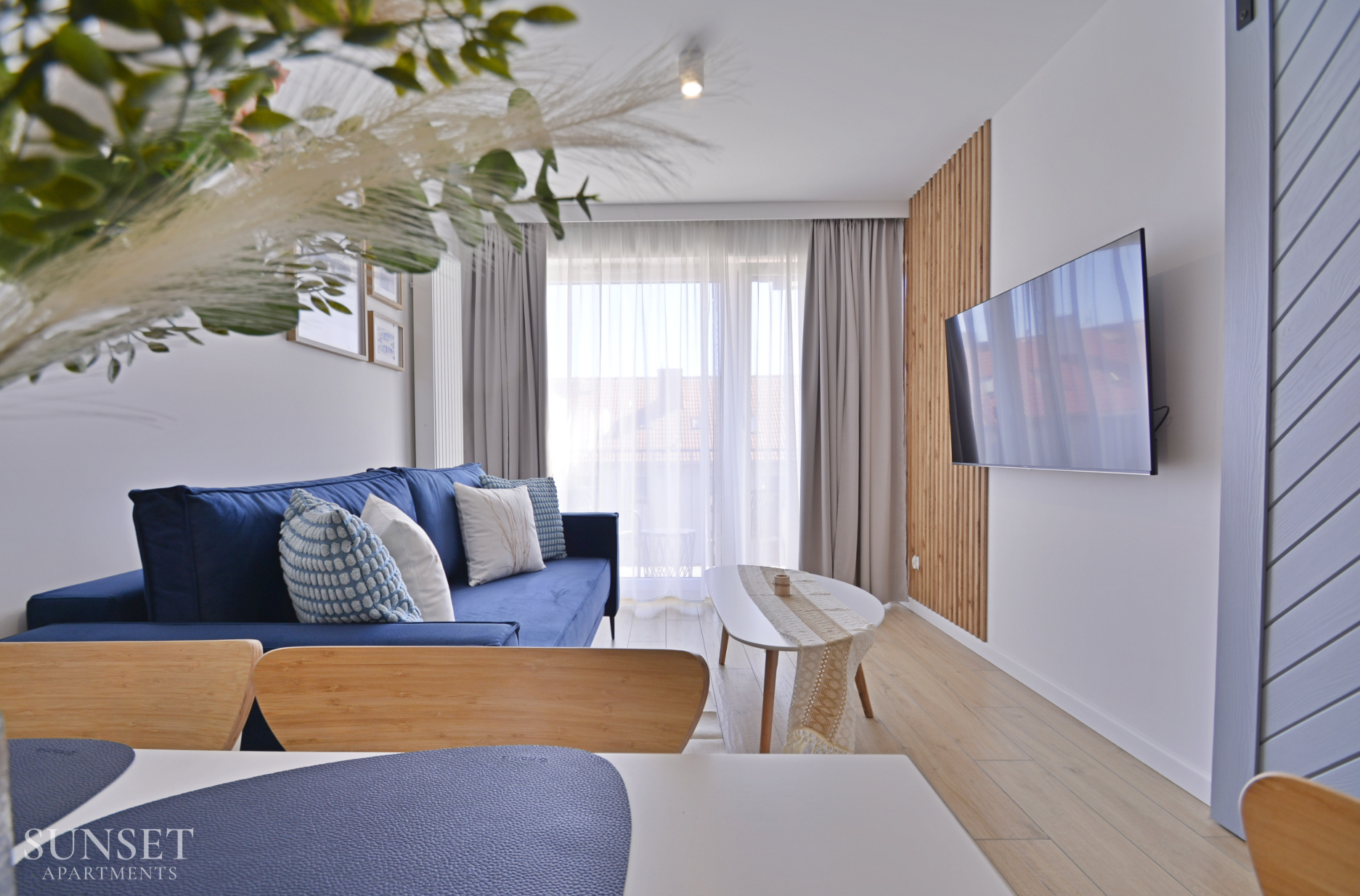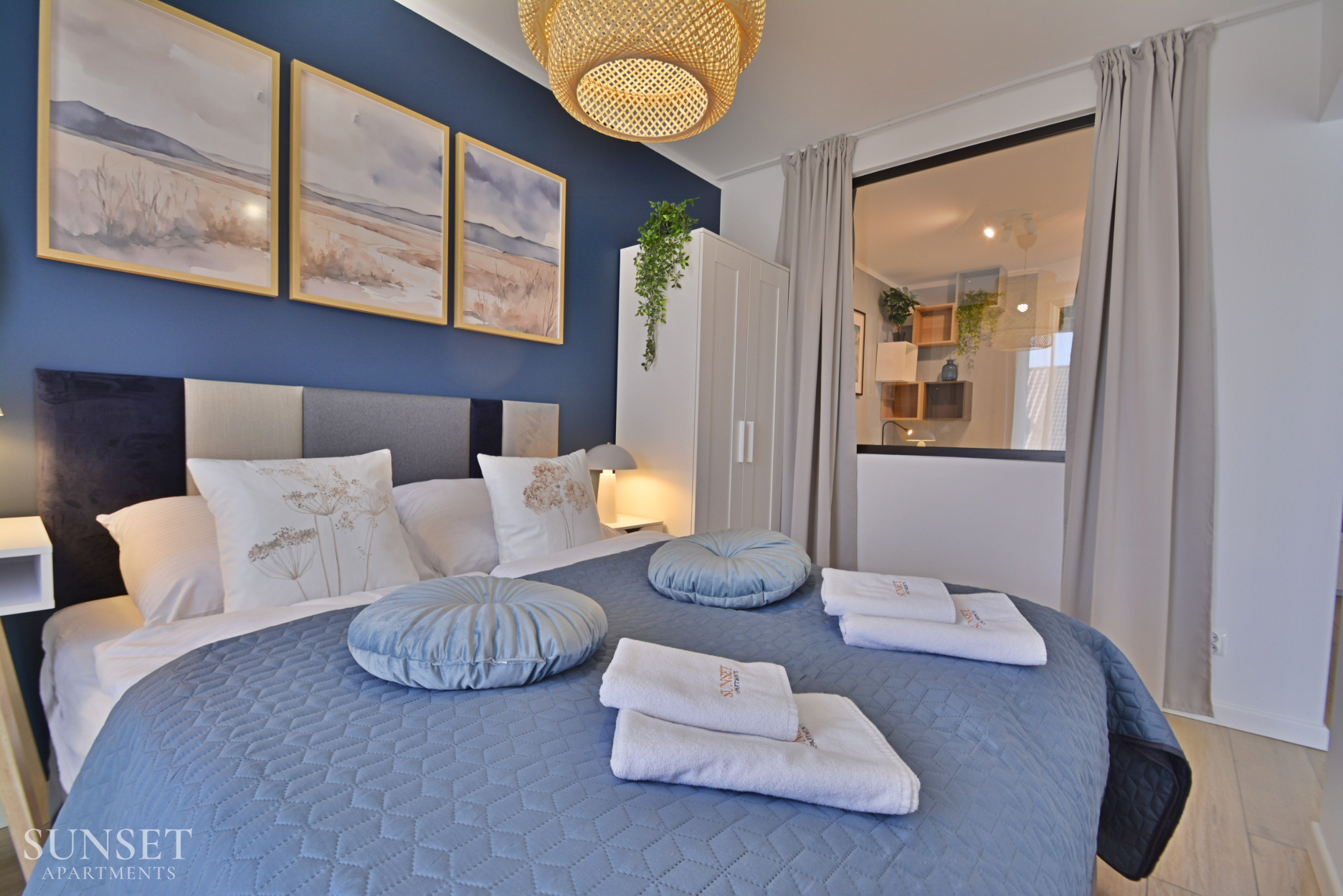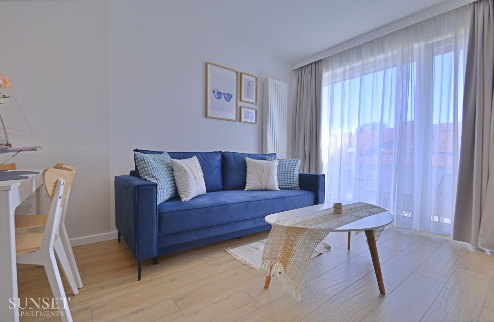 Prezentowany apartament do nowoczesna oferta dla rodzin składająca się z trzech pokoi. Przeznaczona jest dla komfortowego pobytu max. 6 osób. Główna sypialnia wyposażona jest w wygodne łóżko małżeńskie o szerokości 160cm. Odzdzielona jest szybą z zasłonami od dodatkowej przestrzeni sypialnianej. W dodatkowej sypialni znajduje się rozkładana sofa do szerokości 160cm. Słoneczny salon z wygodną sofą i wyjściem na balkon połączony jest z przestronnym aneksem kuchennym. Łazienka wyposażona jest w pralkę, co sprawi że pobyt będzie jeszcze bardziej komfortowy. Oferta posiada prywatne miejsce parkingowe w garażu pod budynkiem - wysokość wjazdu to 1,90m dla samochodów osobowych.