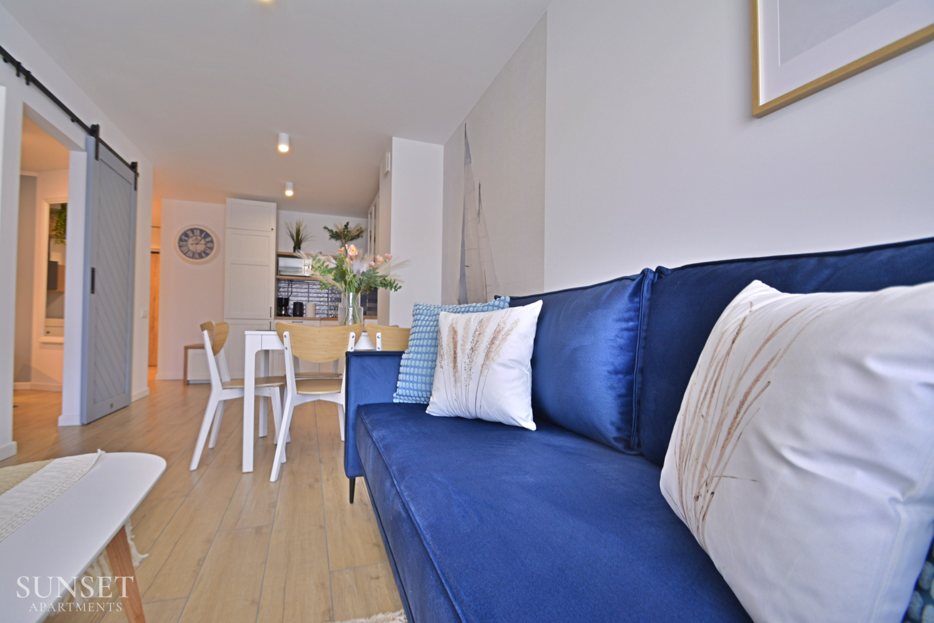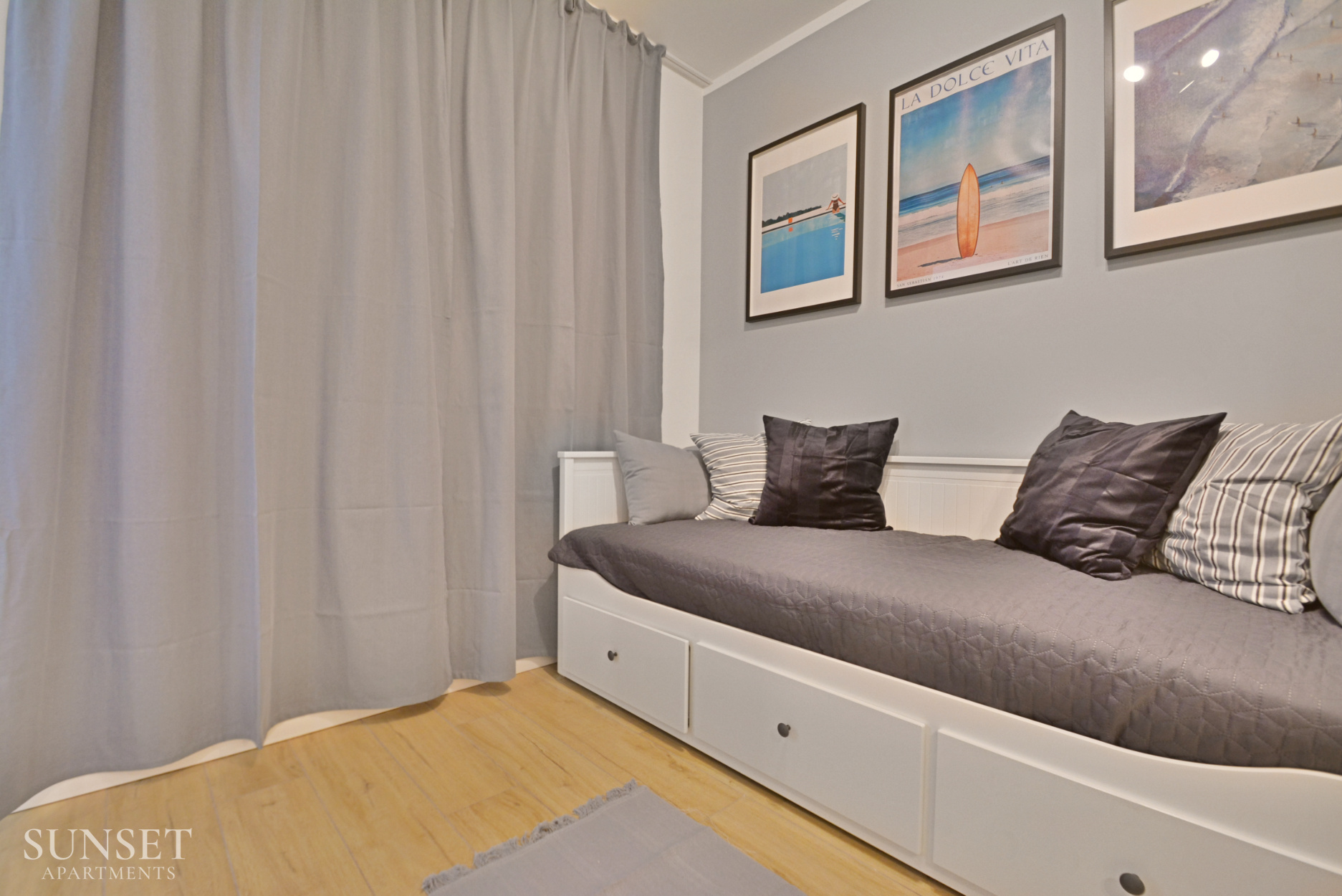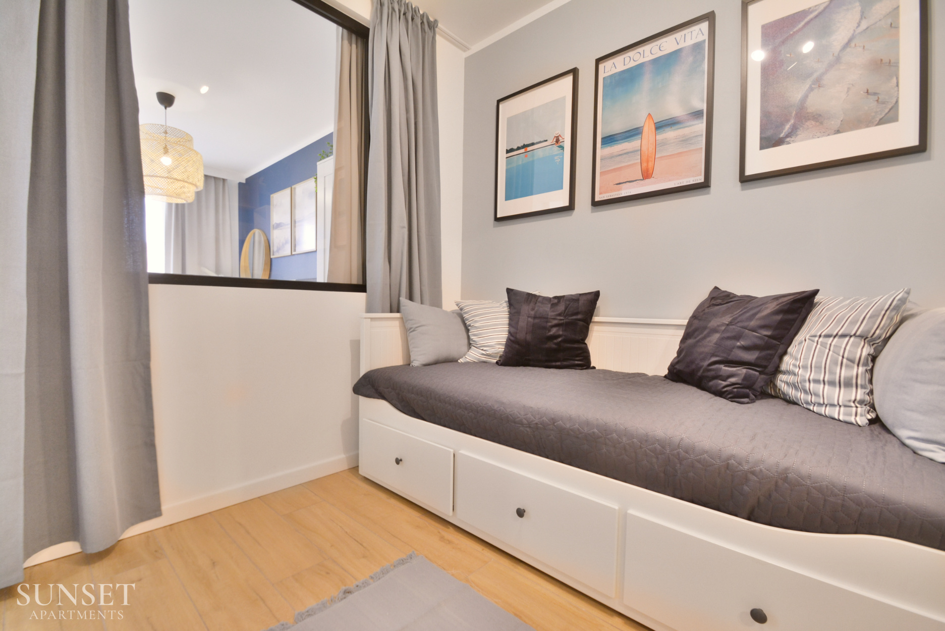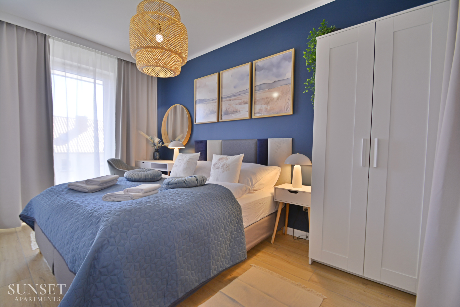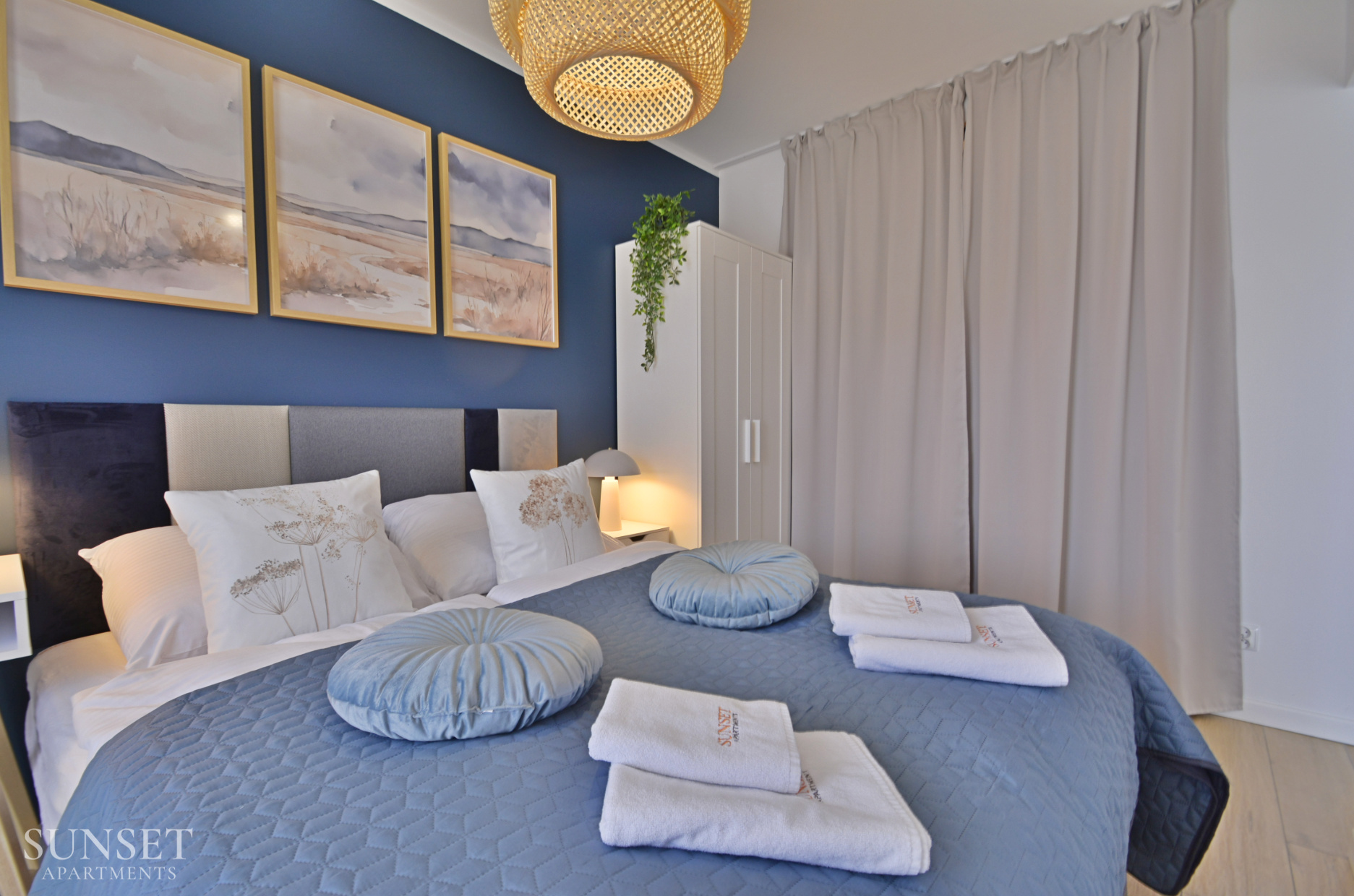 Prezentowany apartament do nowoczesna oferta dla rodzin składająca się z trzech pokoi. Przeznaczona jest dla komfortowego pobytu max. 6 osób. Główna sypialnia wyposażona jest w wygodne łóżko małżeńskie o szerokości 160cm. Odzdzielona jest szybą z zasłonami od dodatkowej przestrzeni sypialnianej. W dodatkowej sypialni znajduje się rozkładana sofa do szerokości 160cm. Słoneczny salon z wygodną sofą i wyjściem na balkon połączony jest z przestronnym aneksem kuchennym. Łazienka wyposażona jest w pralkę, co sprawi że pobyt będzie jeszcze bardziej komfortowy. Oferta posiada prywatne miejsce parkingowe w garażu pod budynkiem - wysokość wjazdu to 1,90m dla samochodów osobowych.
