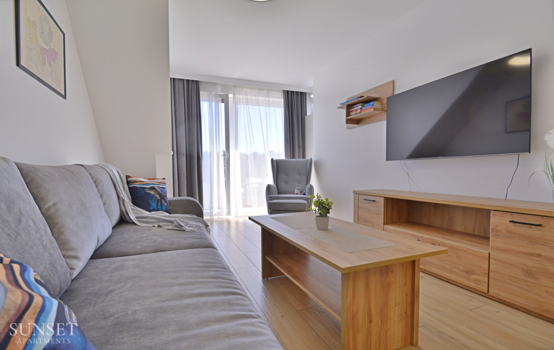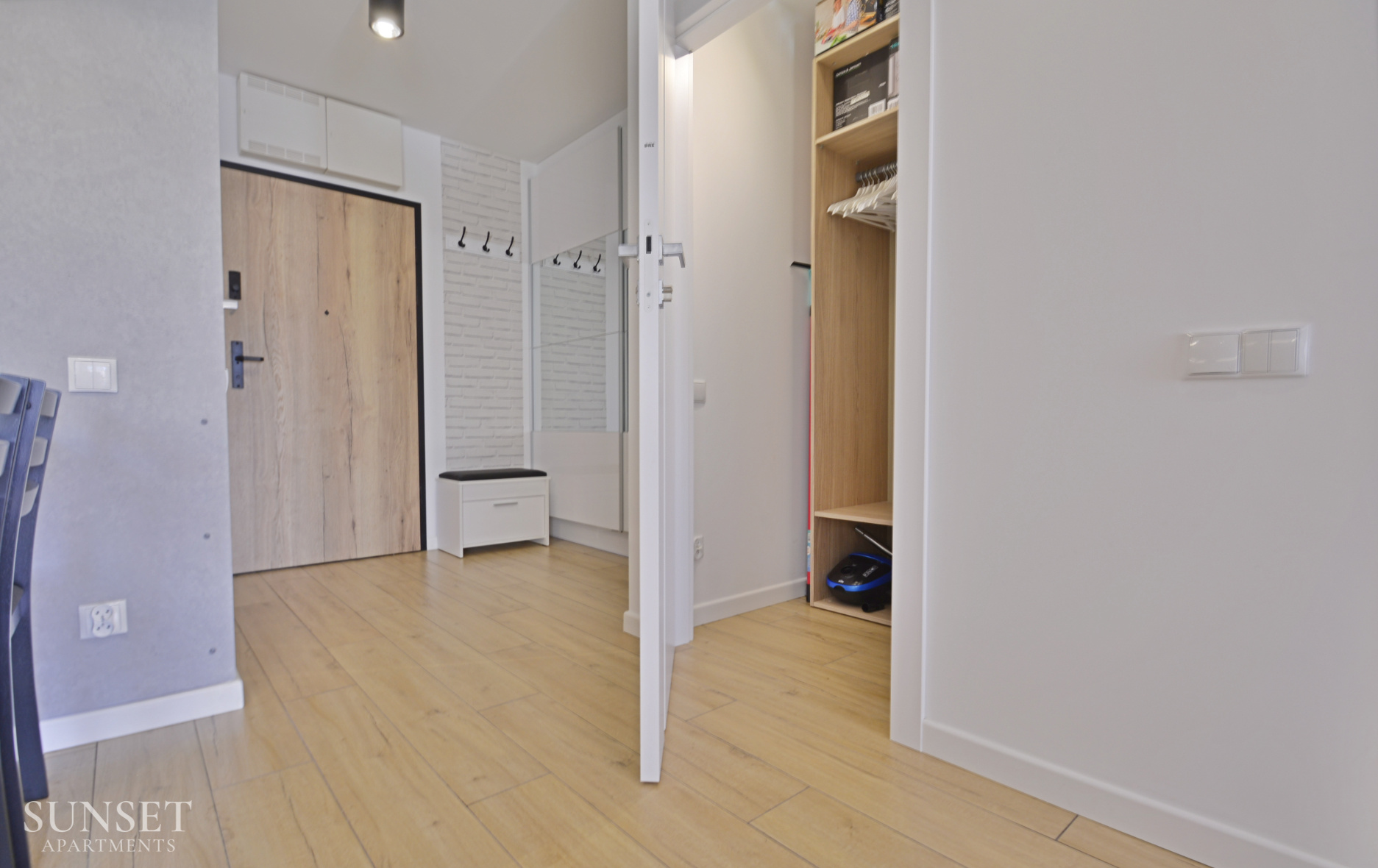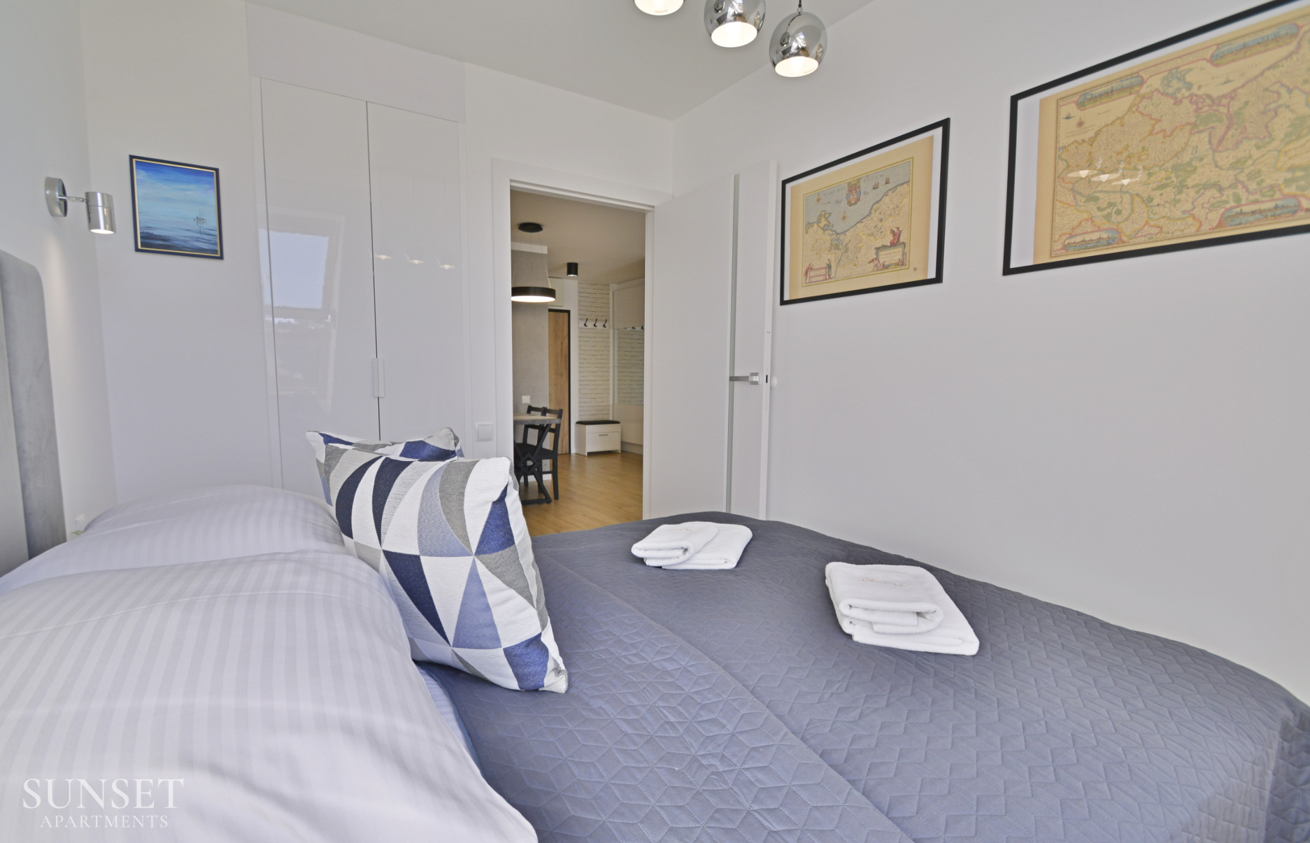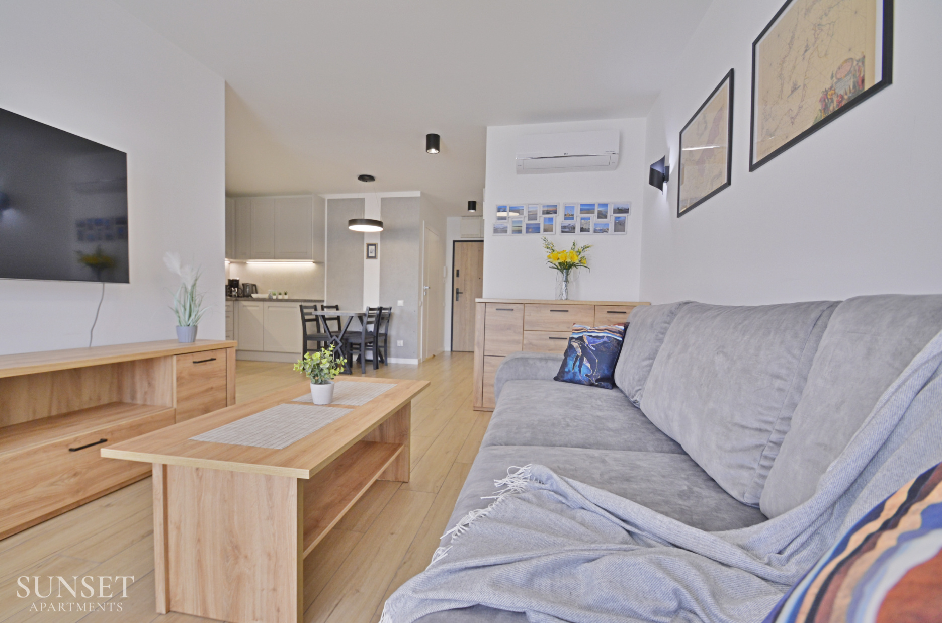 Propozycja "Roosevelta 34" to przytulny apartament idealny dla 4 osób. Znajdziemy w nim przestronny salon z wygodną rozkładaną sofą dla dwóch osób, który połączony jest z aneksem kuchennym. W osobnej sypialni znajduje się wygodne łóżko o szerokości 160cm. Apartament posiada umeblowany balkon, a łazienka posiada pralkę, która sprawi, że pobyt będzie jeszcze bardziej komfortowy. W upalne dni ukojenie przyniesie klimatyzacja. Całość urządzona jest w spokojnych i naturalnych kolorach. Do oferty przynależy prywatne miejsce parkingowe w garażu podziemnym. Wysokość wjazdu to 1,90 m dla samochodów osobowych.