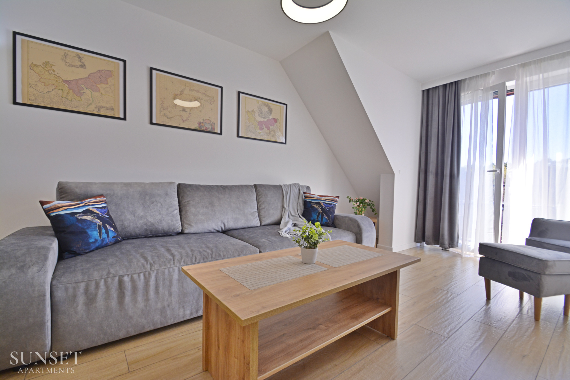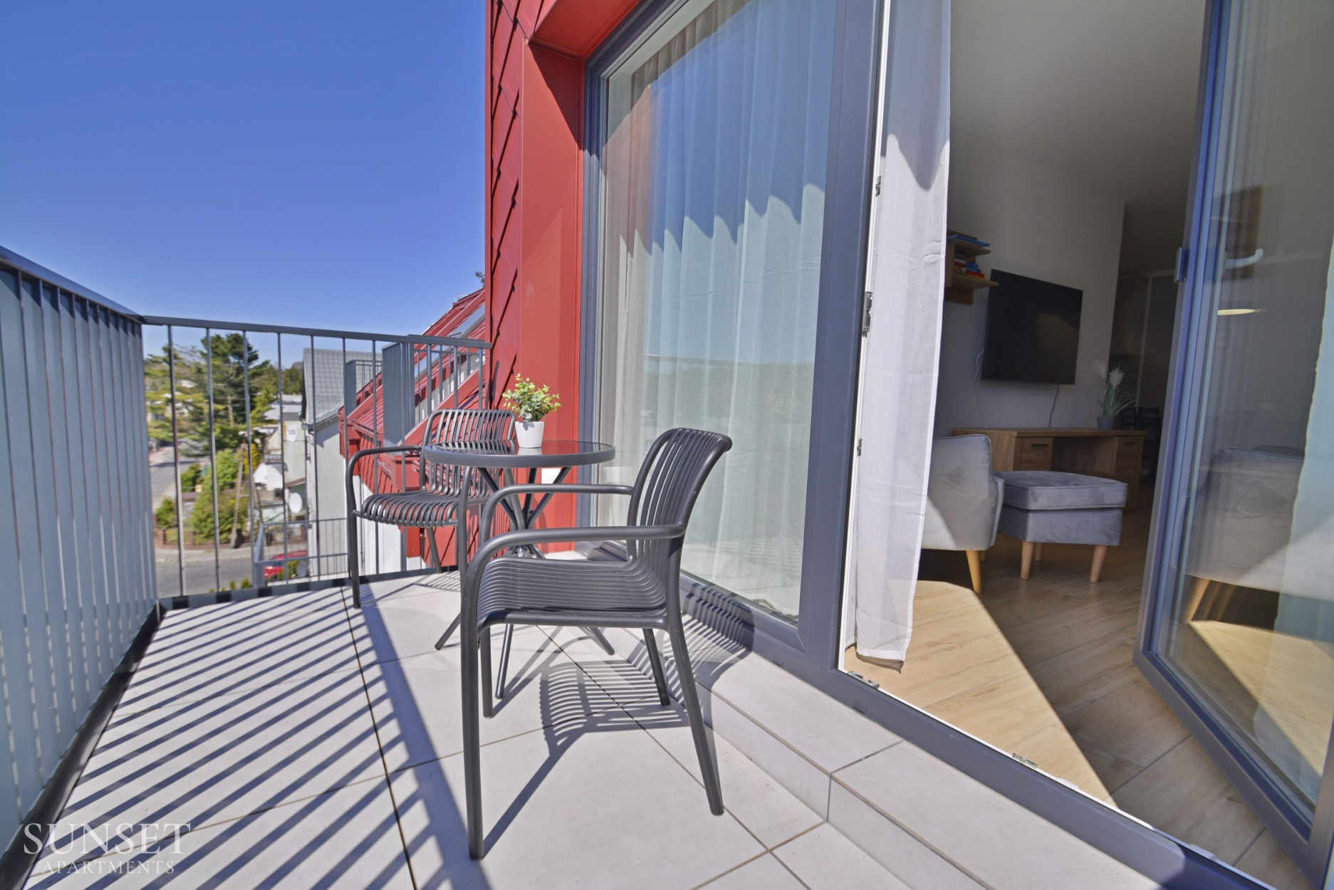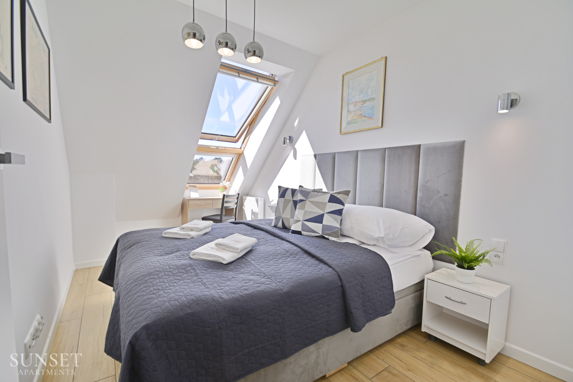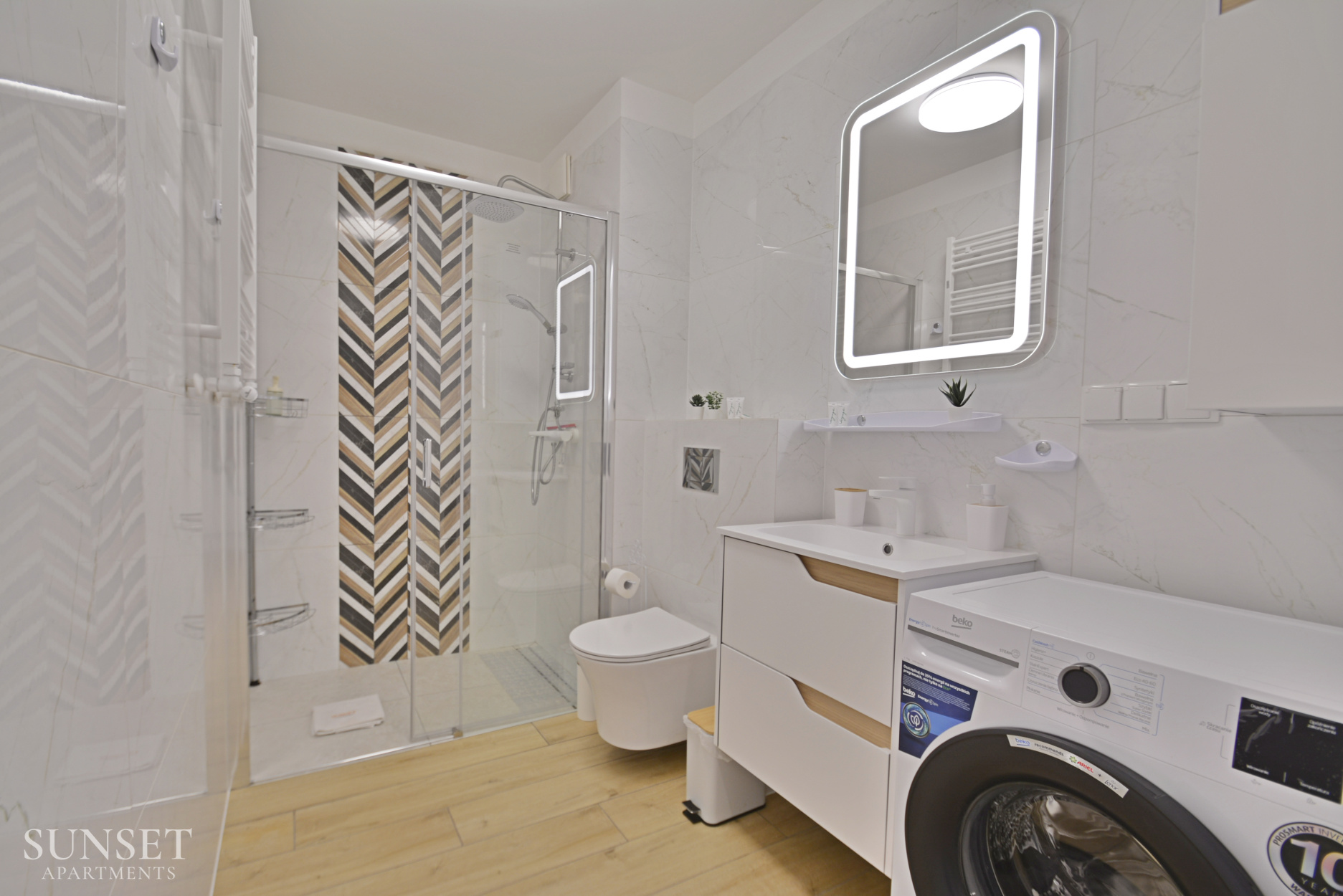Propozycja "Roosevelta 34" to przytulny apartament idealny dla 4 osób. Znajdziemy w nim przestronny salon z wygodną rozkładaną sofą dla dwóch osób, który połączony jest z aneksem kuchennym. W osobnej sypialni znajduje się wygodne łóżko o szerokości 160cm. Apartament posiada umeblowany balkon, a łazienka posiada pralkę, która sprawi, że pobyt będzie jeszcze bardziej komfortowy. W upalne dni ukojenie przyniesie klimatyzacja. Całość urządzona jest w spokojnych i naturalnych kolorach. Do oferty przynależy prywatne miejsce parkingowe w garażu podziemnym. Wysokość wjazdu to 1,90 m dla samochodów osobowych.