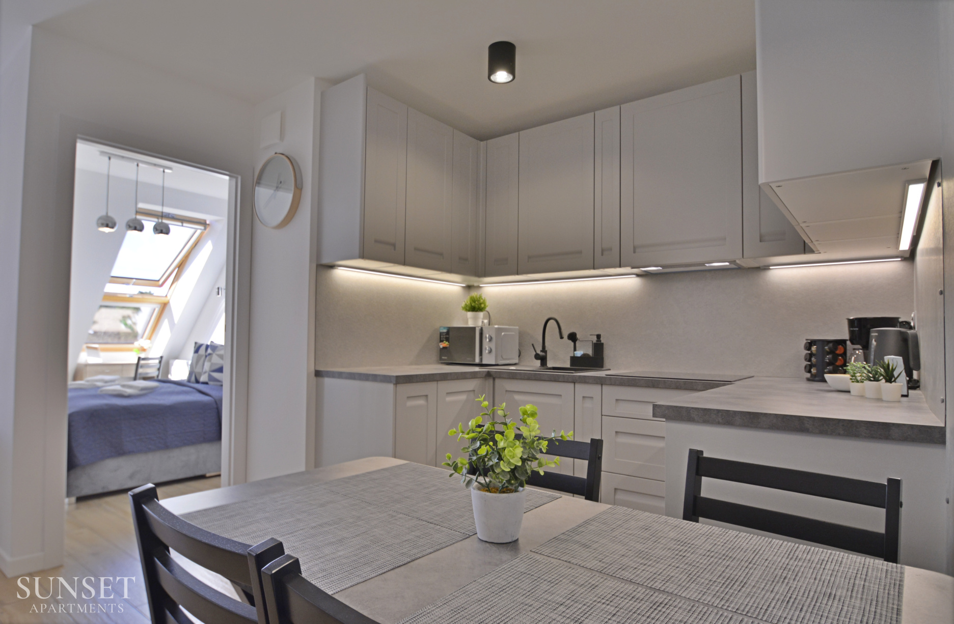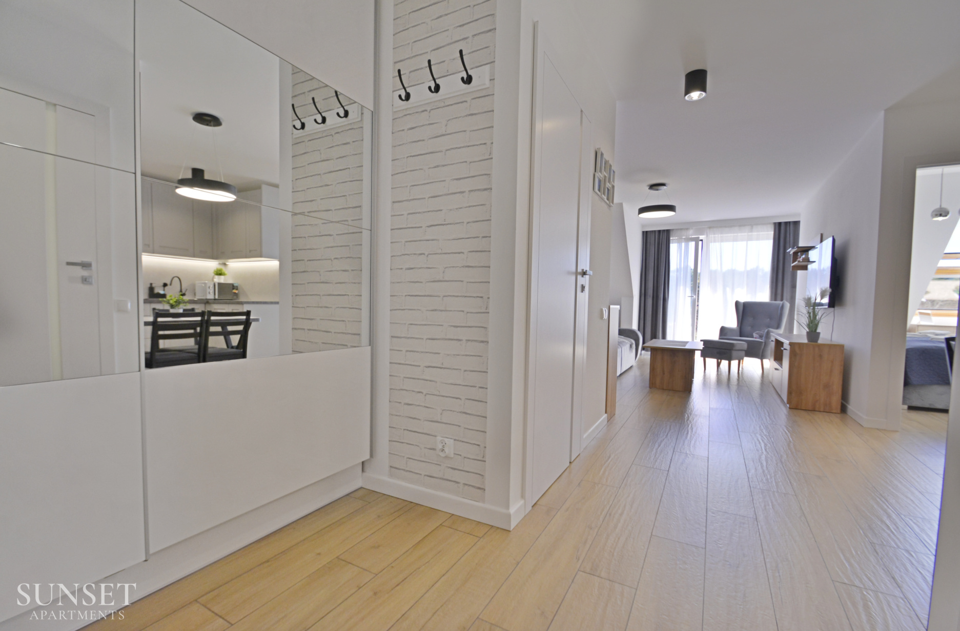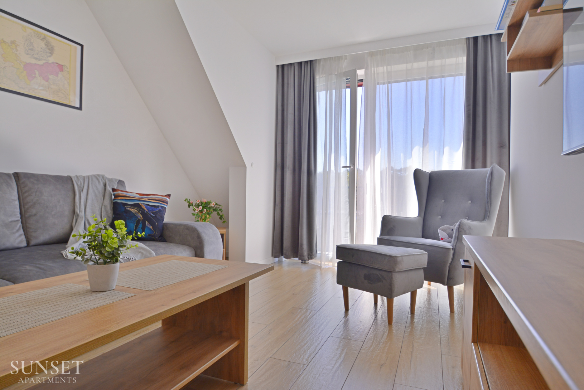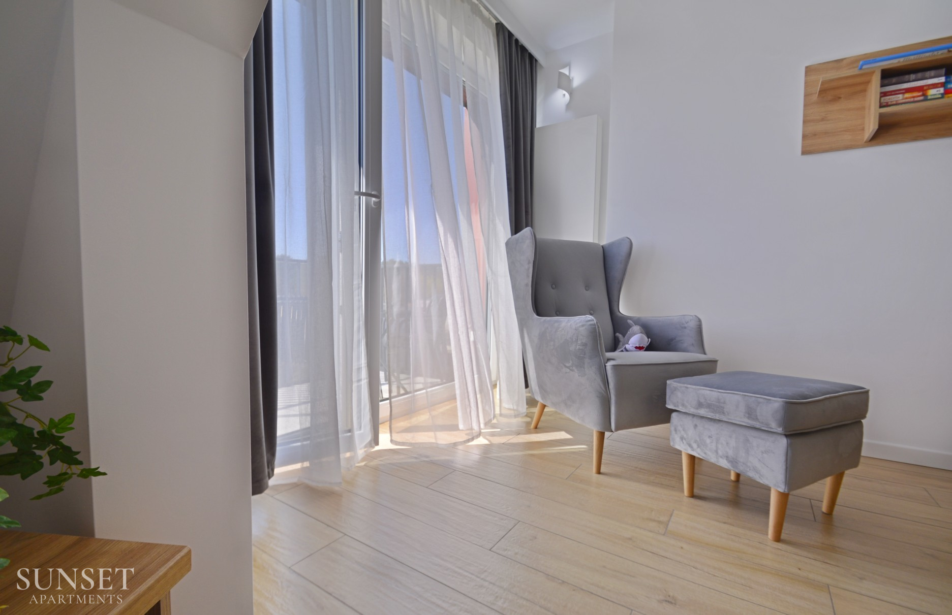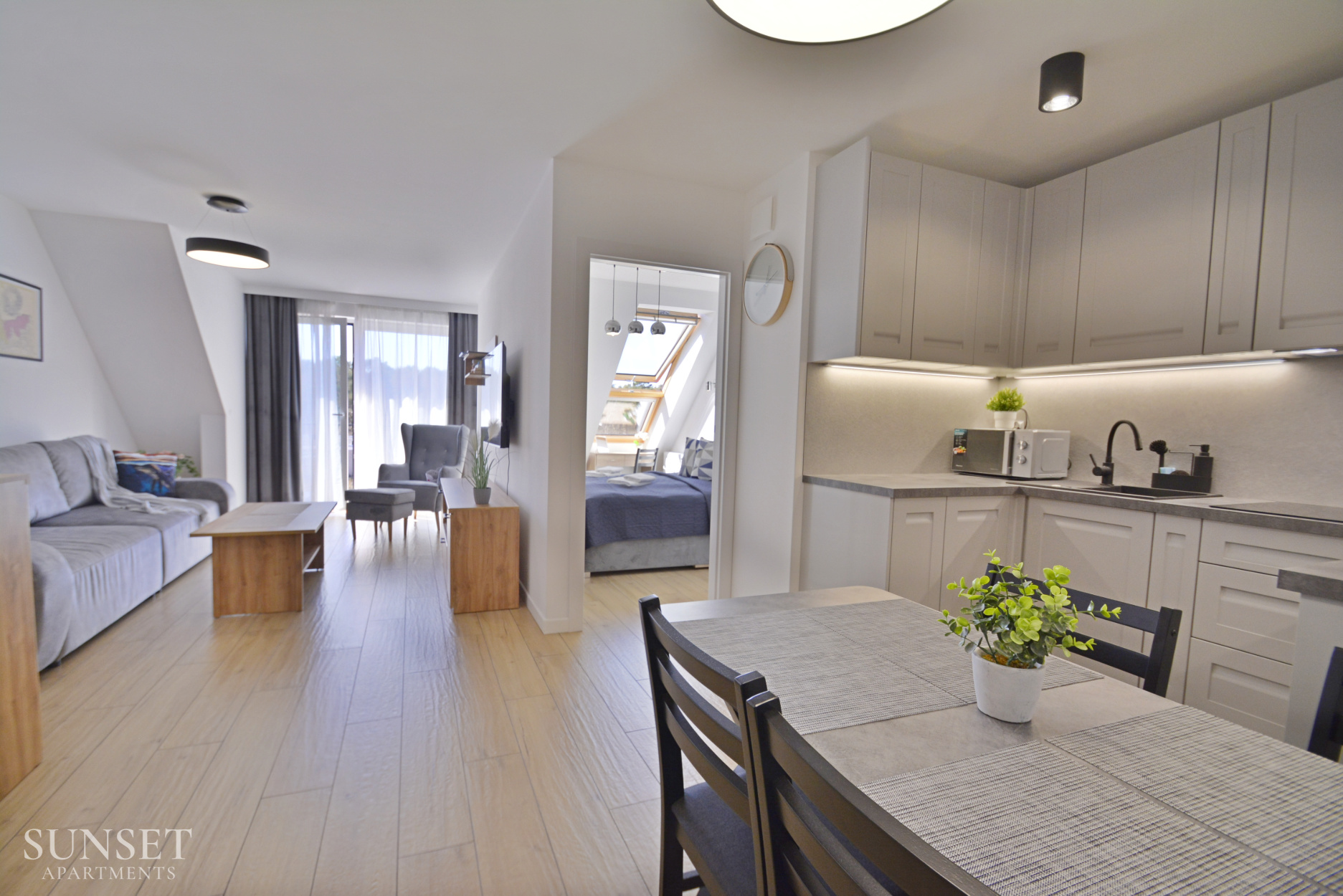 Propozycja "Roosevelta 34" to przytulny apartament idealny dla 4 osób. Znajdziemy w nim przestronny salon z wygodną rozkładaną sofą dla dwóch osób, który połączony jest z aneksem kuchennym. W osobnej sypialni znajduje się wygodne łóżko o szerokości 160cm. Apartament posiada umeblowany balkon, a łazienka posiada pralkę, która sprawi, że pobyt będzie jeszcze bardziej komfortowy. W upalne dni ukojenie przyniesie klimatyzacja. Całość urządzona jest w spokojnych i naturalnych kolorach. Do oferty przynależy prywatne miejsce parkingowe w garażu podziemnym. Wysokość wjazdu to 1,90 m dla samochodów osobowych.