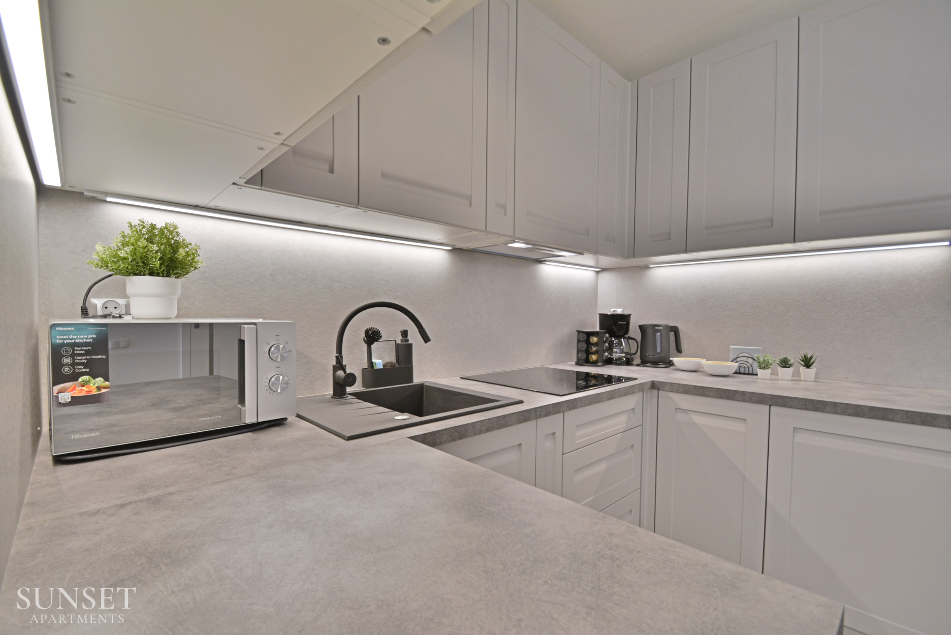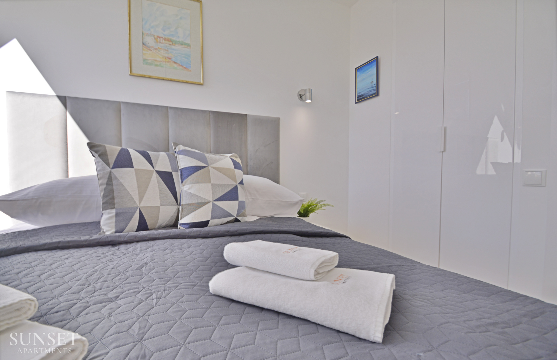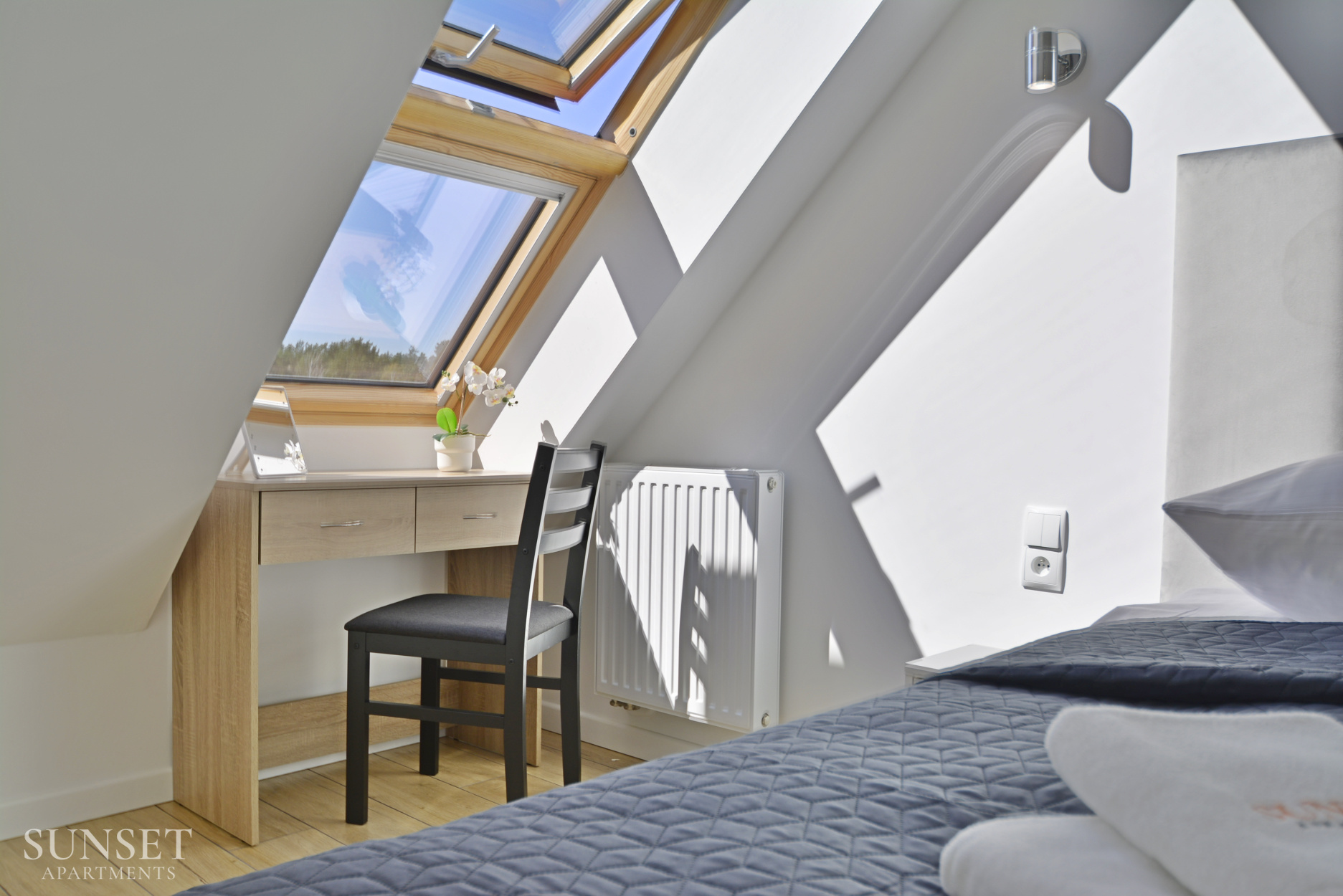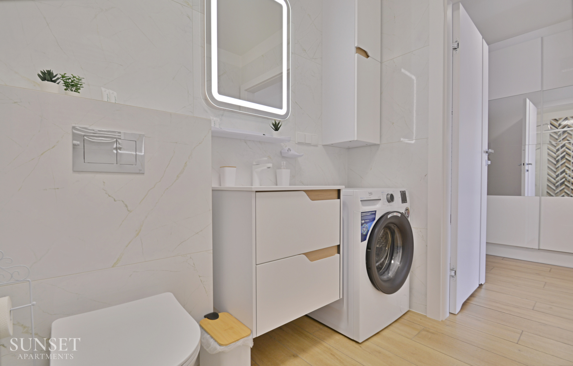 Propozycja "Roosevelta 34" to przytulny apartament idealny dla 4 osób. Znajdziemy w nim przestronny salon z wygodną rozkładaną sofą dla dwóch osób, który połączony jest z aneksem kuchennym. W osobnej sypialni znajduje się wygodne łóżko o szerokości 160cm. Apartament posiada umeblowany balkon, a łazienka posiada pralkę, która sprawi, że pobyt będzie jeszcze bardziej komfortowy. W upalne dni ukojenie przyniesie klimatyzacja. Całość urządzona jest w spokojnych i naturalnych kolorach. Do oferty przynależy prywatne miejsce parkingowe w garażu podziemnym. Wysokość wjazdu to 1,90 m dla samochodów osobowych.