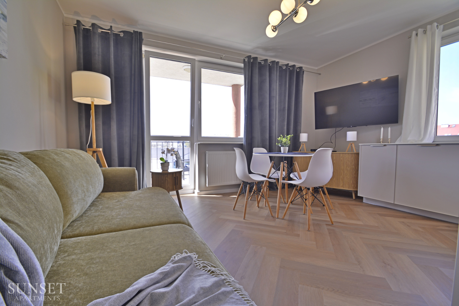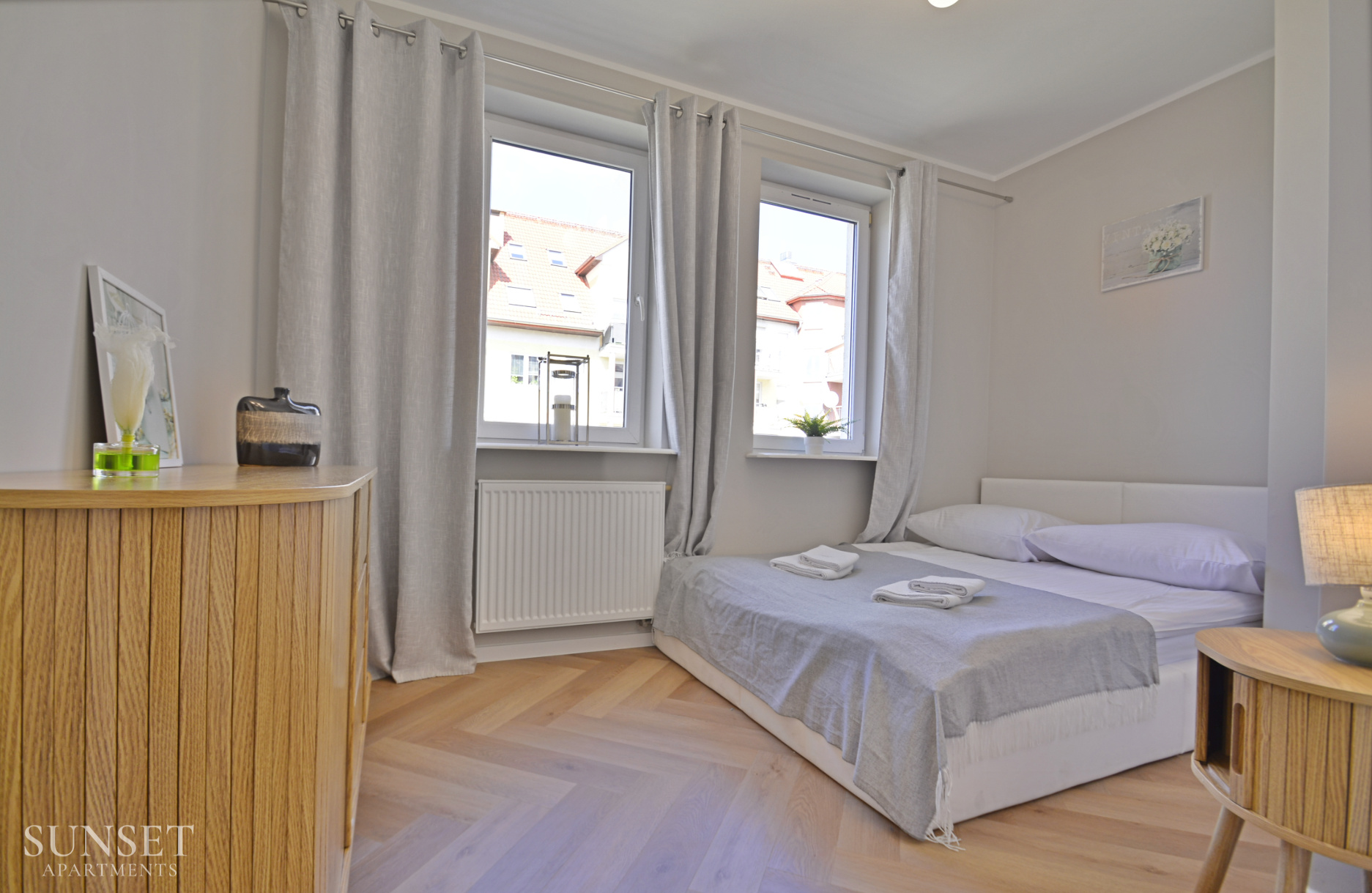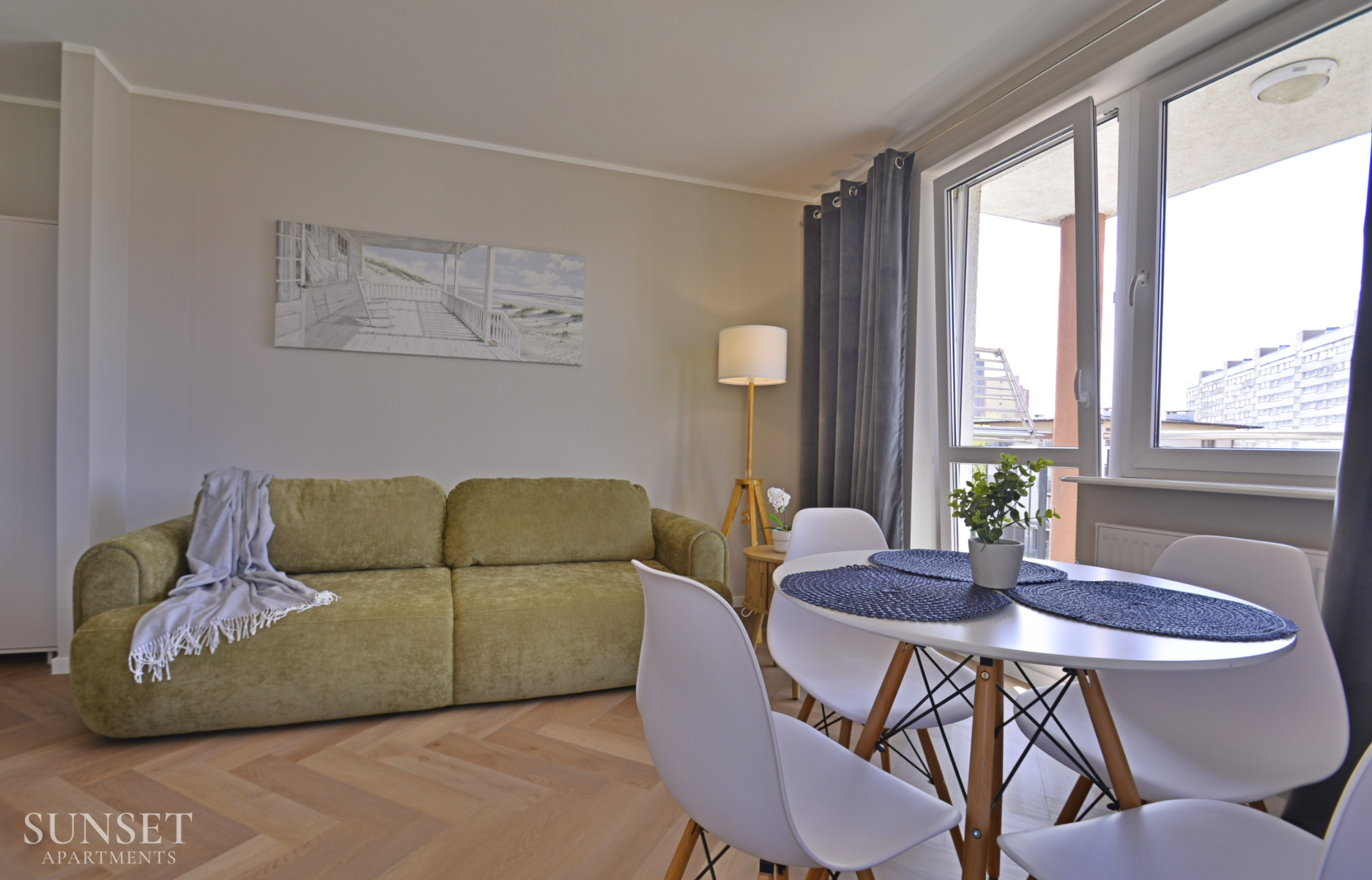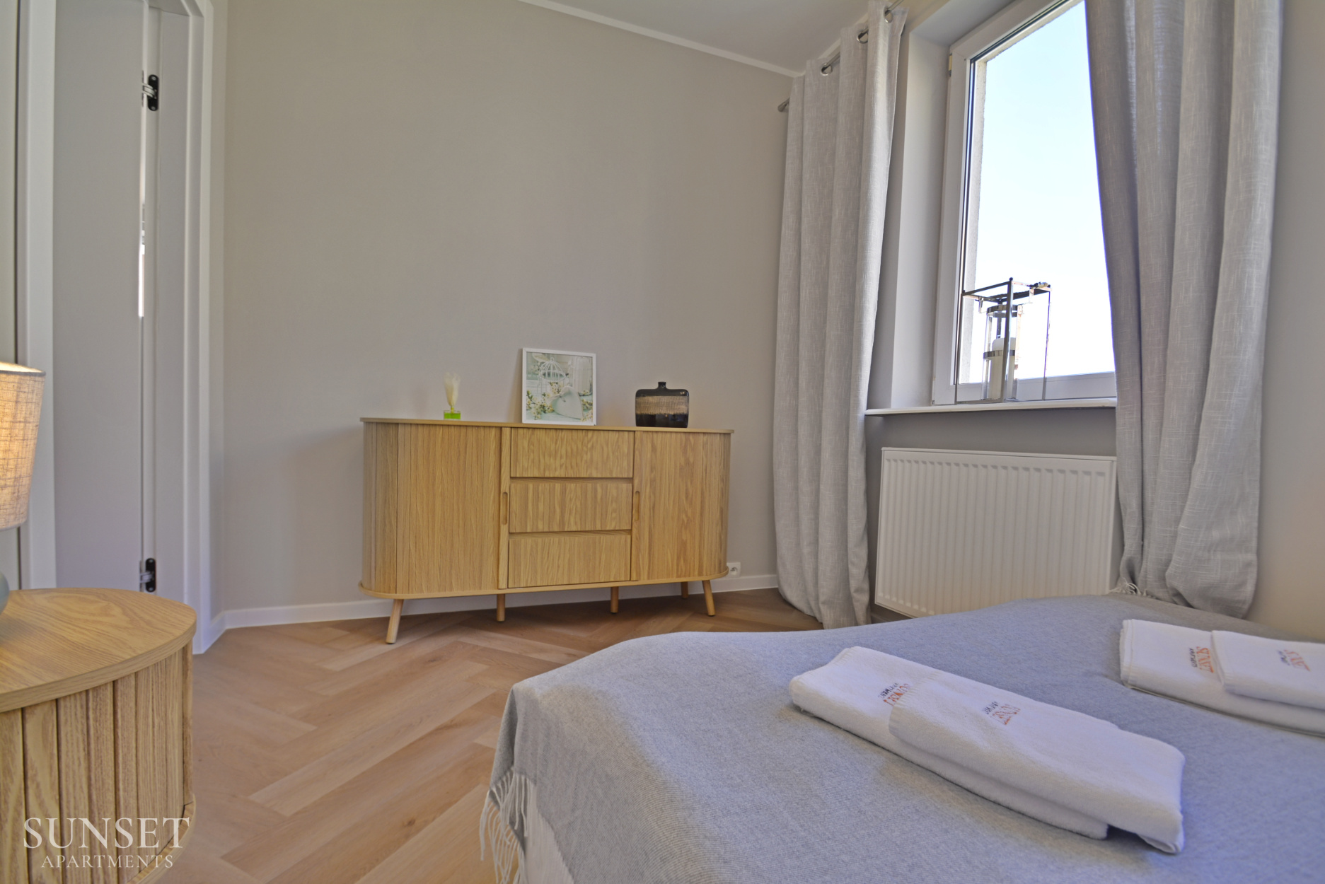 Oferowany apartament posiada 2 pokoje i przygotowany jest dla pobytu max. 4 osób. Aneks kuchenny połączony jest ze słonecznym salonem, z którego jest wyjście na umeblowany balkon. Wygodna sofa przygotowana jest dla dwóch osób. W sypialni znajduje się łóżko małżeńskie o szerokości 140cm. Zabudowana pralka w aneksie kuchennym sprawi, że pobyt będzie jeszcze bardziej komfortowy. Całość urządzona jest w przyjemnych i spokojnych dla oka barwach.
