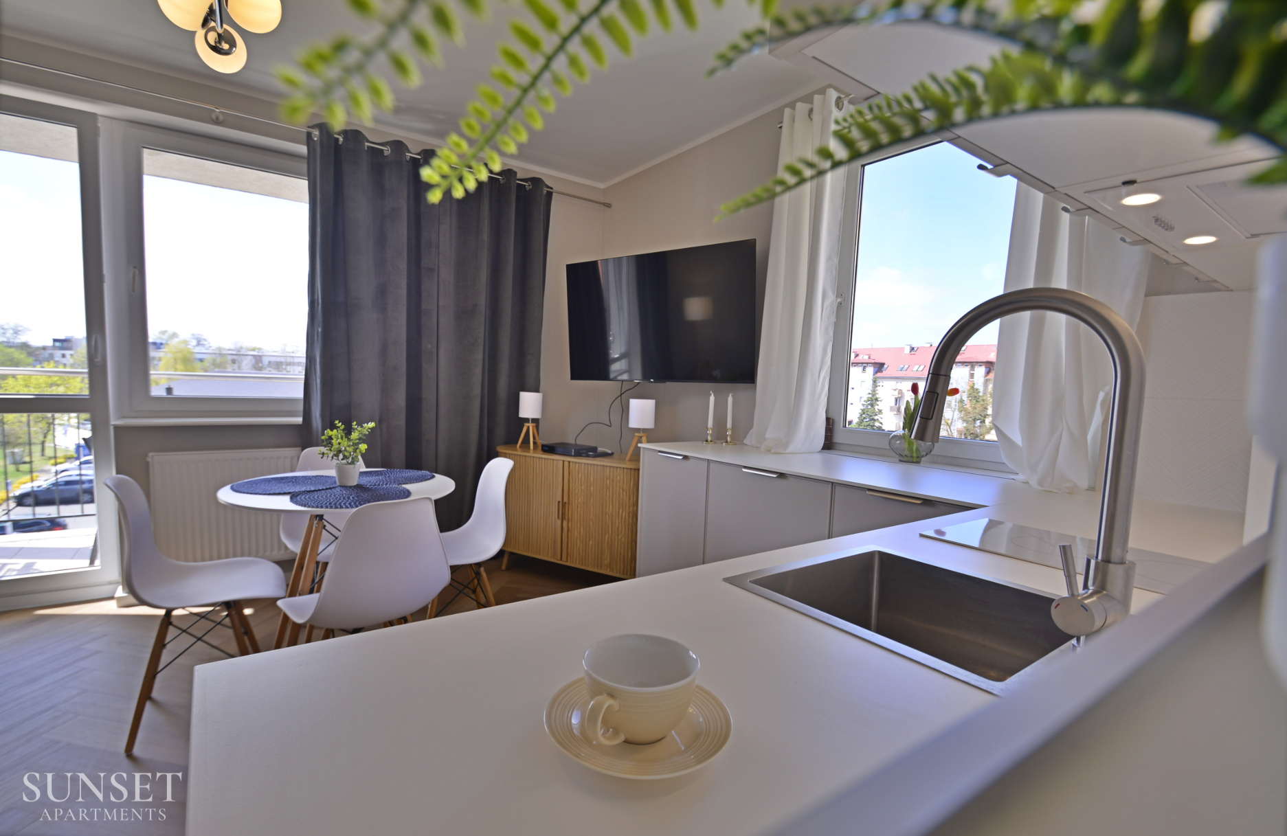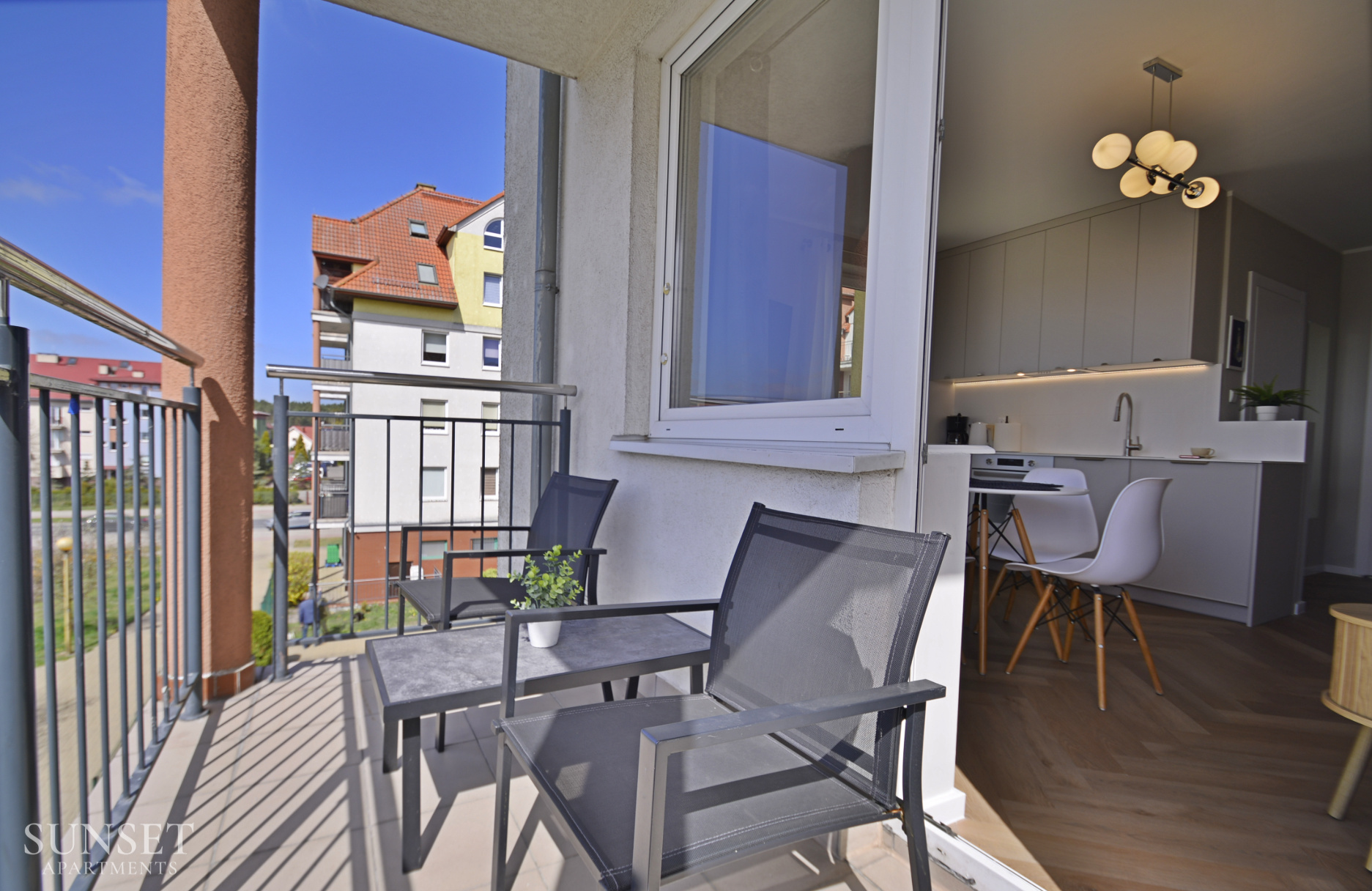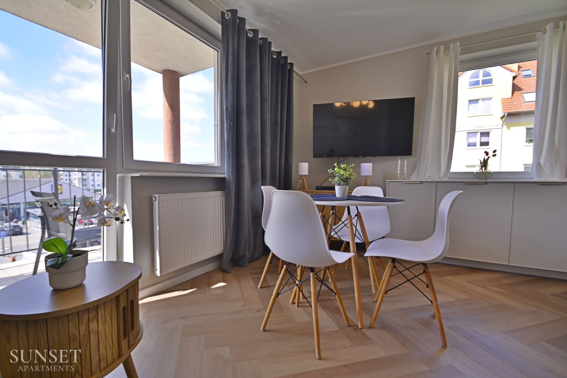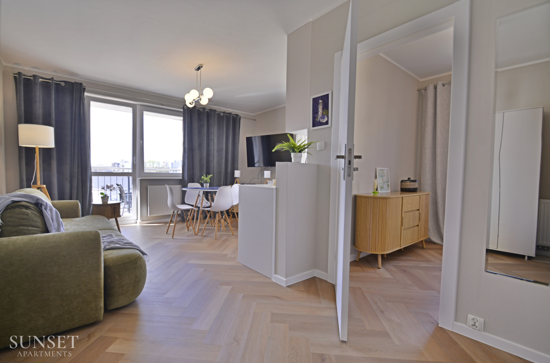 Oferowany apartament posiada 2 pokoje i przygotowany jest dla pobytu max. 4 osób. Aneks kuchenny połączony jest ze słonecznym salonem, z którego jest wyjście na umeblowany balkon. Wygodna sofa przygotowana jest dla dwóch osób. W sypialni znajduje się łóżko małżeńskie o szerokości 140cm. Zabudowana pralka w aneksie kuchennym sprawi, że pobyt będzie jeszcze bardziej komfortowy. Całość urządzona jest w przyjemnych i spokojnych dla oka barwach.