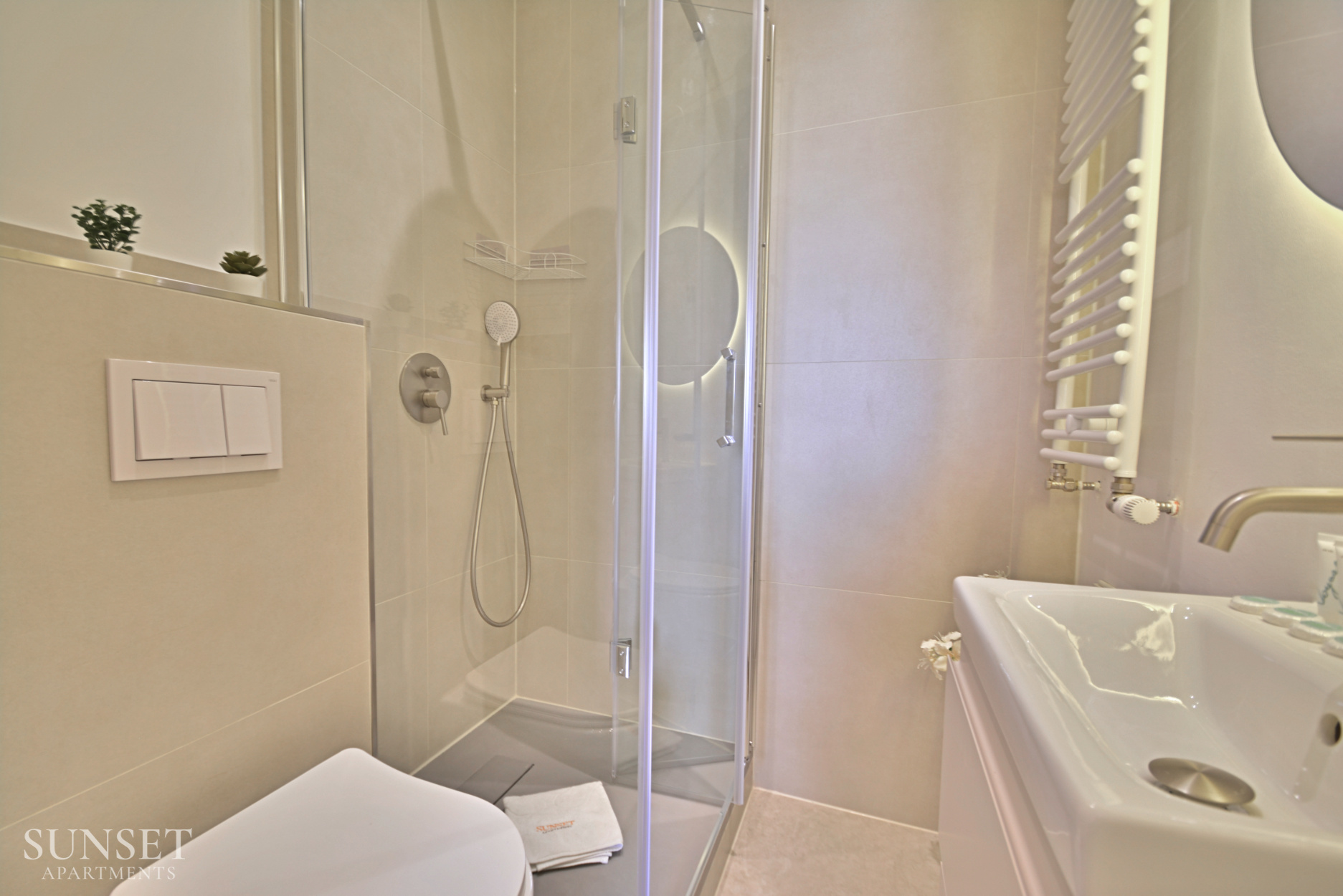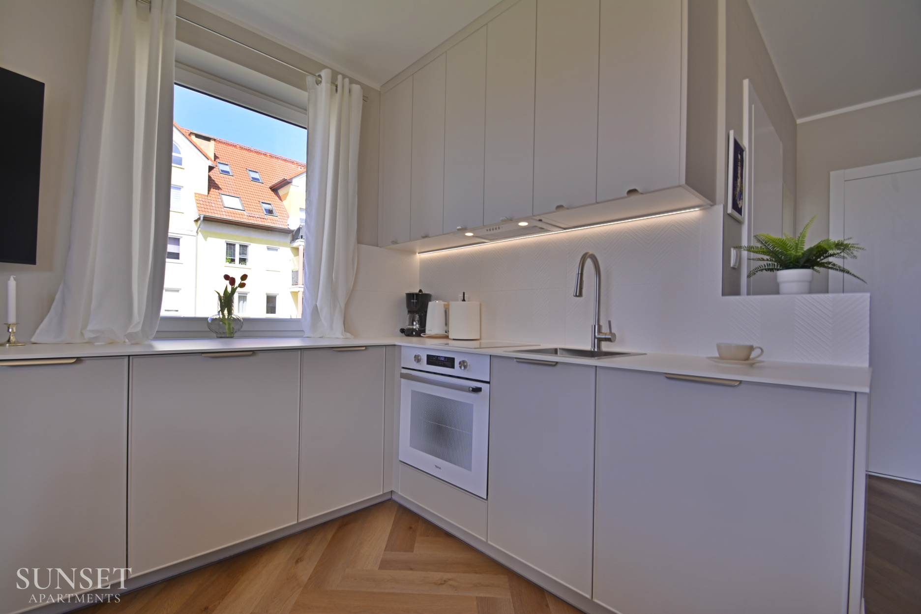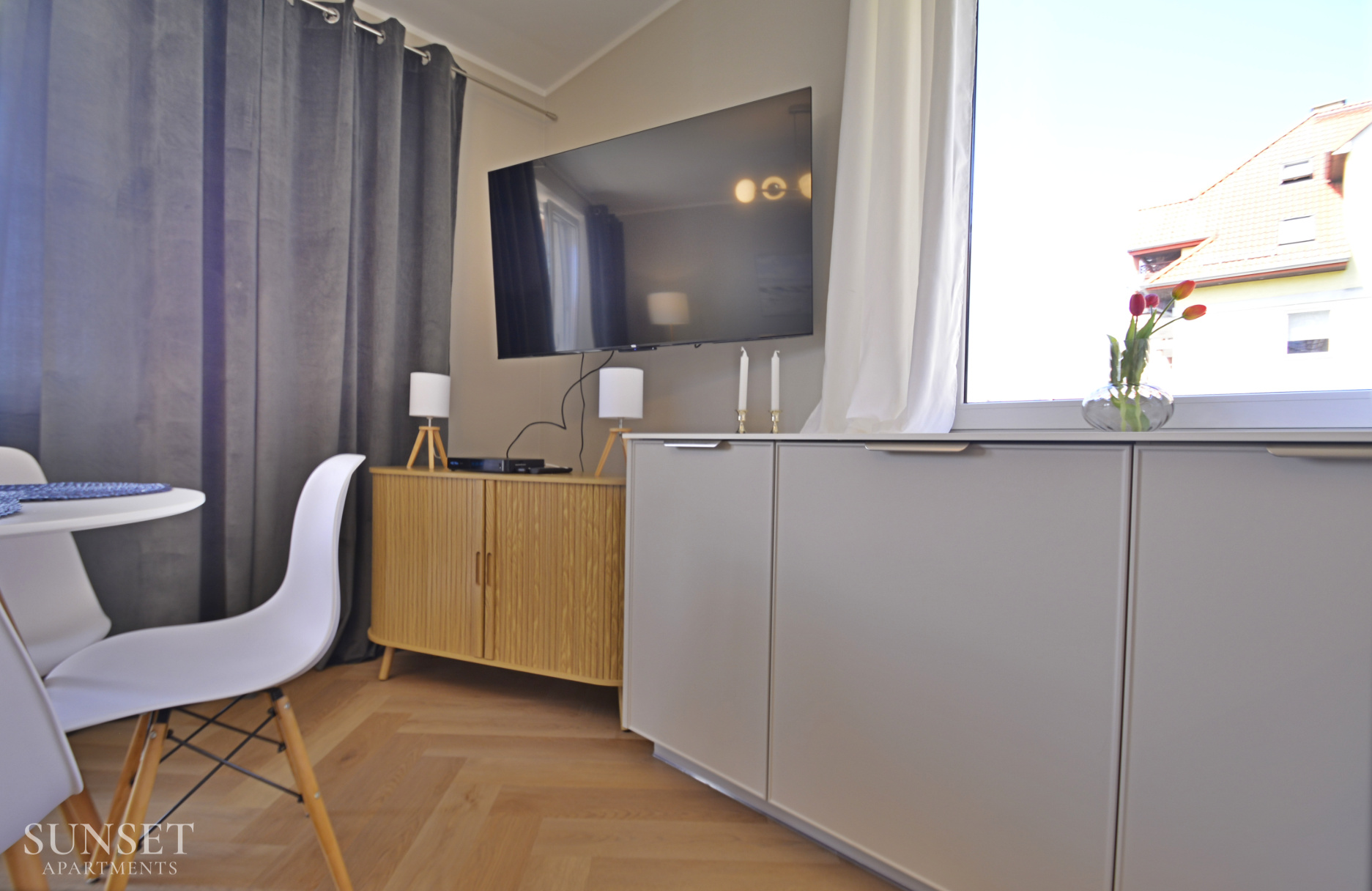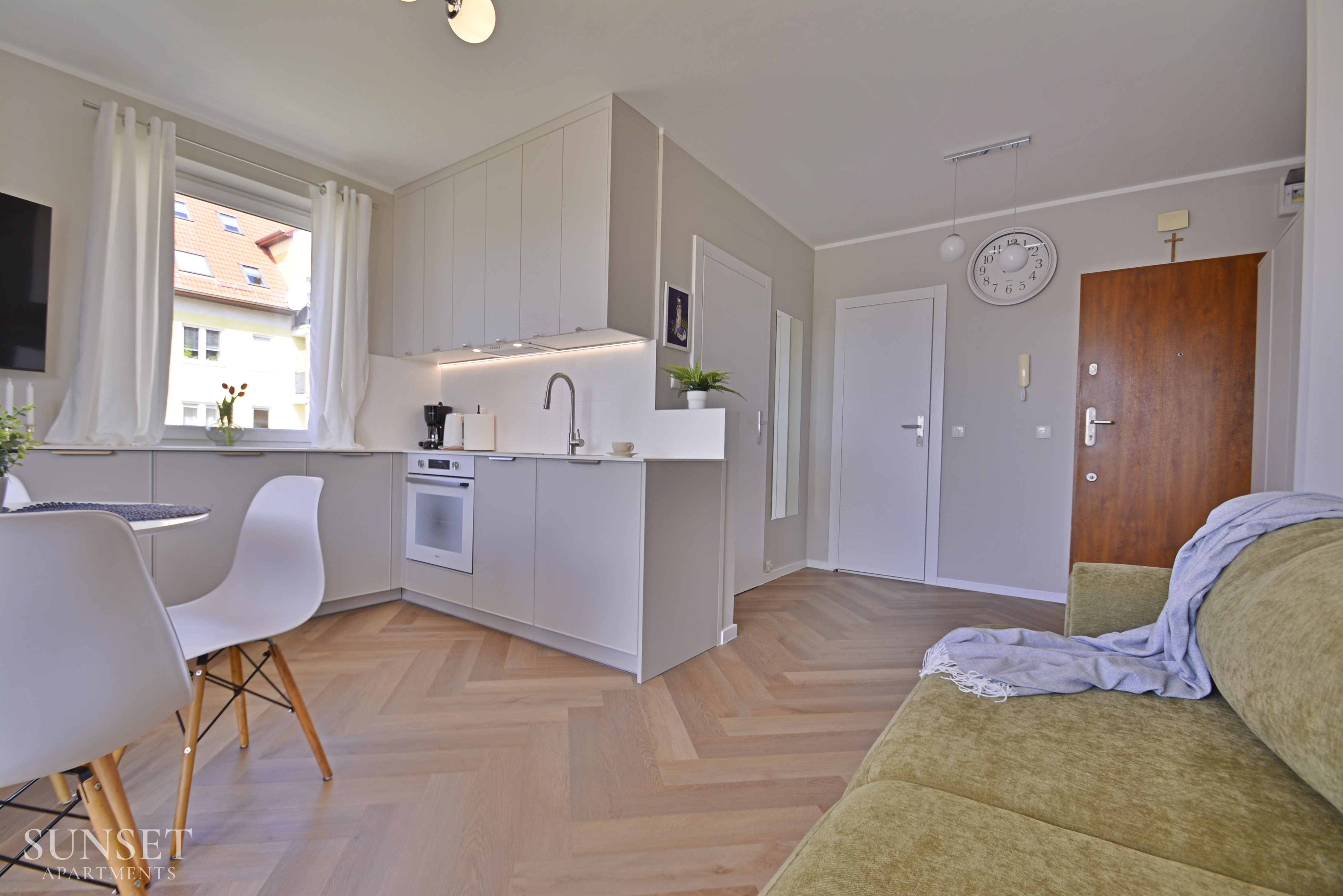 Oferowany apartament posiada 2 pokoje i przygotowany jest dla pobytu max. 4 osób. Aneks kuchenny połączony jest ze słonecznym salonem, z którego jest wyjście na umeblowany balkon. Wygodna sofa przygotowana jest dla dwóch osób. W sypialni znajduje się łóżko małżeńskie o szerokości 140cm. Zabudowana pralka w aneksie kuchennym sprawi, że pobyt będzie jeszcze bardziej komfortowy. Całość urządzona jest w przyjemnych i spokojnych dla oka barwach.